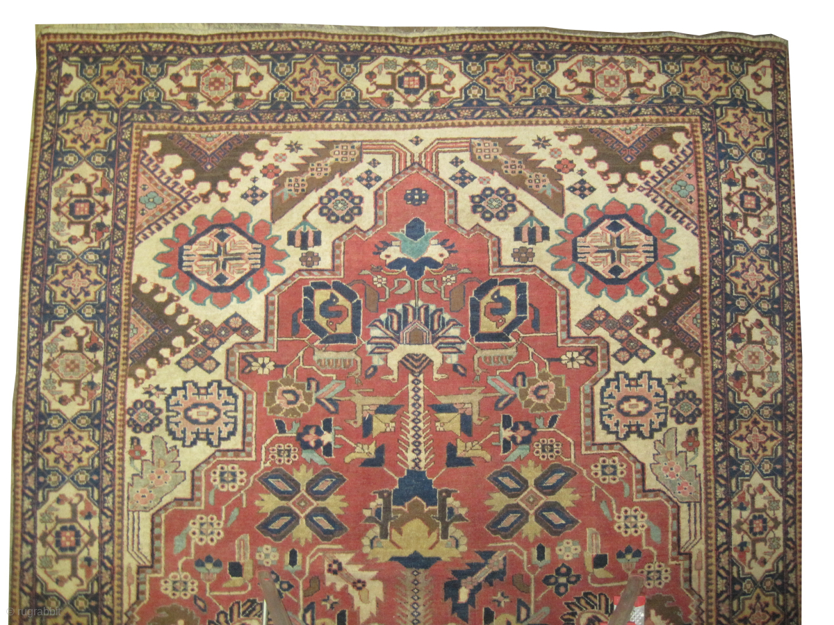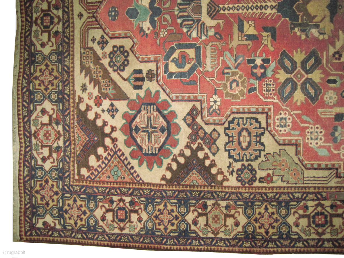 Vegetable dyes, the black knots are oxidized, the knots are hand spun lamb wool, the background color is salmon, the four corners are ivory, the surrounded border is blue decorated with ivory turtles, a tiny hole(2x3cm) at the center is already repaired, the technique of the workmanship is like a Sarouk carpet, thick pile, finely knotted, rare design, elegant carpet.