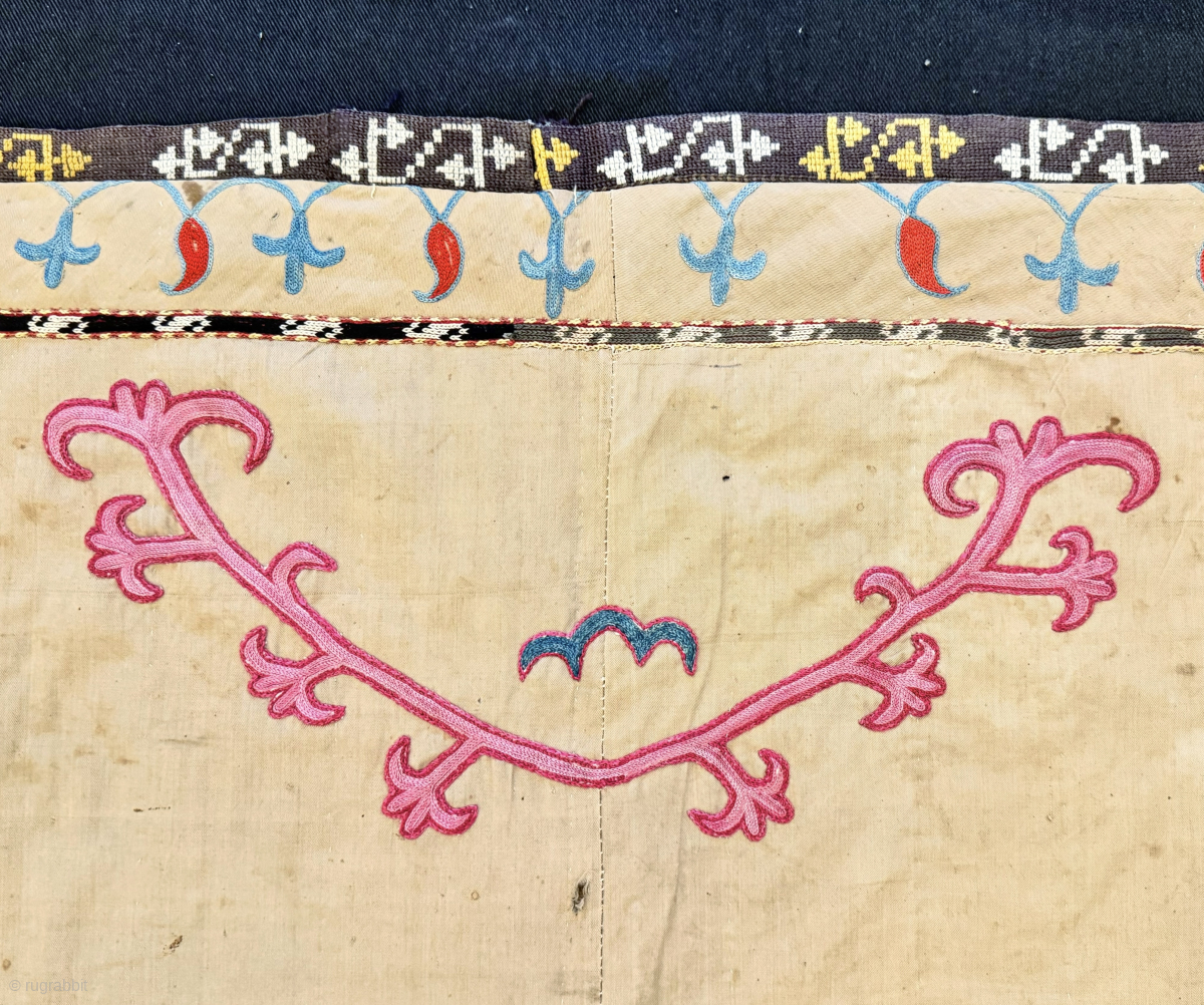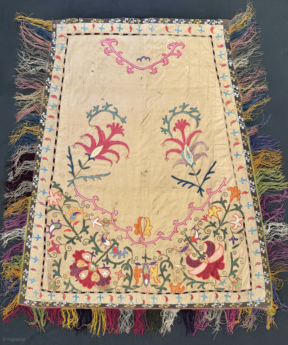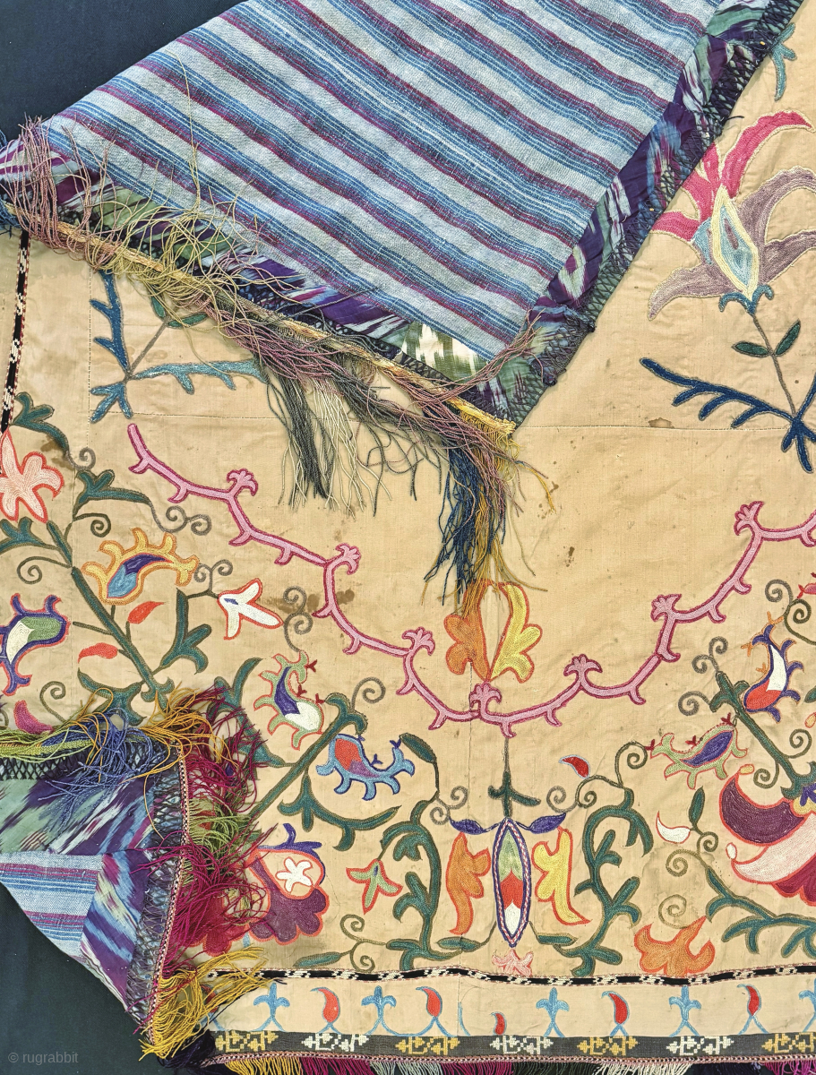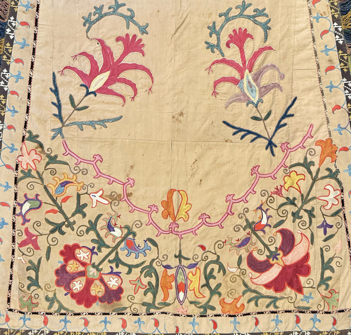 a fine antique Uzbek Shahrisabz silk embroidered mihrab suzani repurposed into a saddle cover / horse blanket. The original Suzani would have dated to the late 19th century / early 1900’s and since silk was valued like gold in Central Asia and often recycled than disposed, at some point in its history this Suzani was repurposed into this saddle cover. It has very fine silk chain-stitched embroidery on a classic beige woven ground often associated with suzanis of Karshi or Shahrisabz region. The floral design and colours are vibrant. Unlike original saddle covers the shape of this is elongated. It has been finished with a cotton lining and silk cotton Ikat edging and lovely polychrome silk tassels. a reconstructed but fun piece from a broken antique Suzani which still echoed the textile art of the era. Offered at a reasonable price. Size: 141cm x 125cm / 85cm (55.5” x 49” / 33”). ….. (If you message via rugrabbit and don’t get a response within 24 hours, then your message hasn’t got to us so please email directly to: istalificollections@outlook.com.)