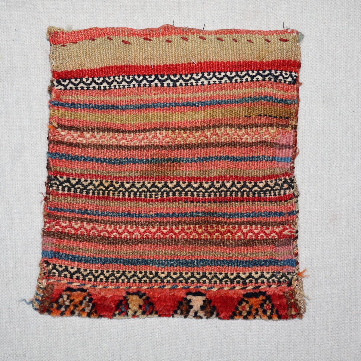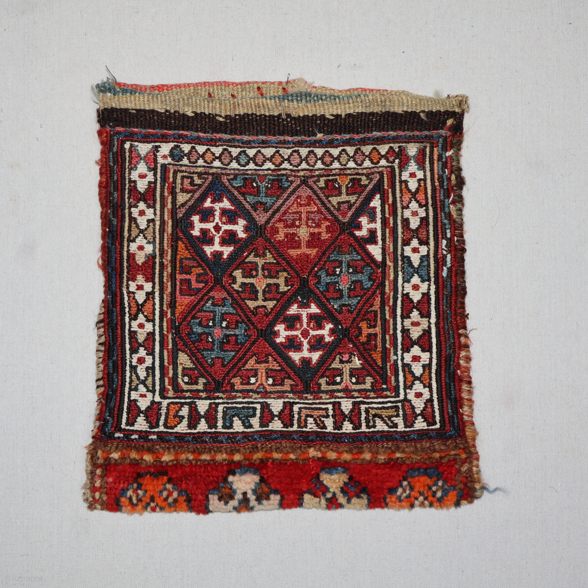 a finely woven late 19th-century Qashqai chanteh, with excellent colors and design elements. It has a very nice band of carpet. Cotton is used for the white, which is highly unusual and rare. It's in excellent condition for its age with an original multi-colored back. Please get in touch directly via email at rubiadarya@mymts.net