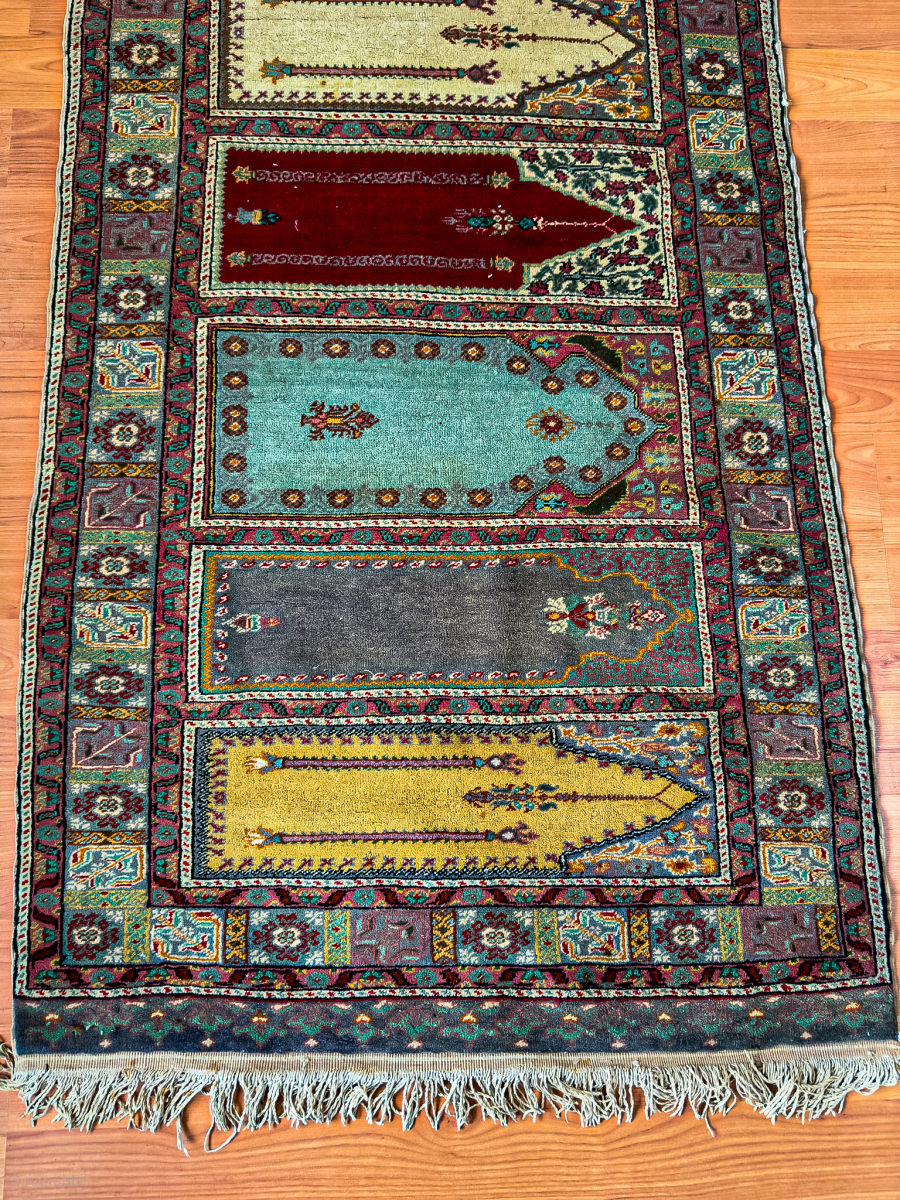 Design: "Saf Prayer Rug" format, featuring multiple colorful, consecutive panels, each adorned with an elegant mihrab design. The striking colors—including deep red, turquoise, yellow, cream, and gray-blue—showcase the unparalleled vibrancy of natural dyes.