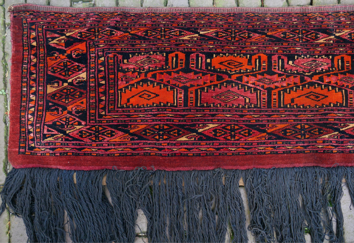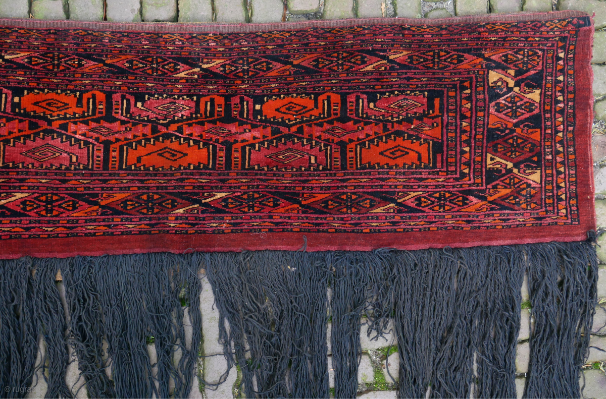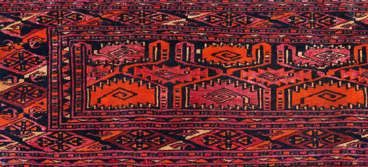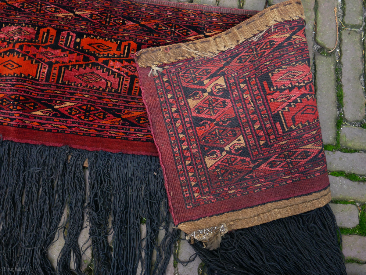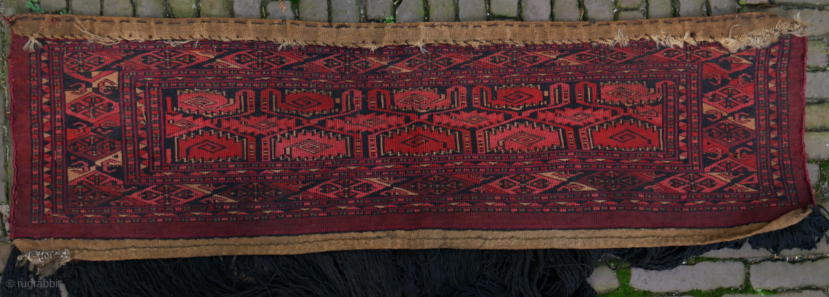 Exceptional rare Salor or Saryk torba - trapping with curled leaf motif. It is fine in weave and includes a high proportion of ruby silk that creates a particularly splendid appearance. The sand color is also silk. Very deep sparkling colours. According to Rippon and Boswell less than ten Salor trappings with curled leaf designs have been published. i couln't find any torba with this combination of motif and use of colour. 125 x 35 cm.