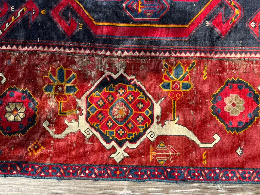 A rare and expressive village weaving from the Kuba region, likely Gymyl or nearby. The deep indigo field features a bold octagonal medallion with angular talismanic hooks. The rug is framed by a striking cartouche border composed of large octagonal medallions with central rosettes—alternating in ivory and red—linked by stylized vines and cross motifs, typical of Kuba and Gymyl-area rugs. a lower field panel includes tribal glyphs or pseudo-script, echoing a dated Gymyl rug from 1902 (Baku Museum, Inv. No. 884).