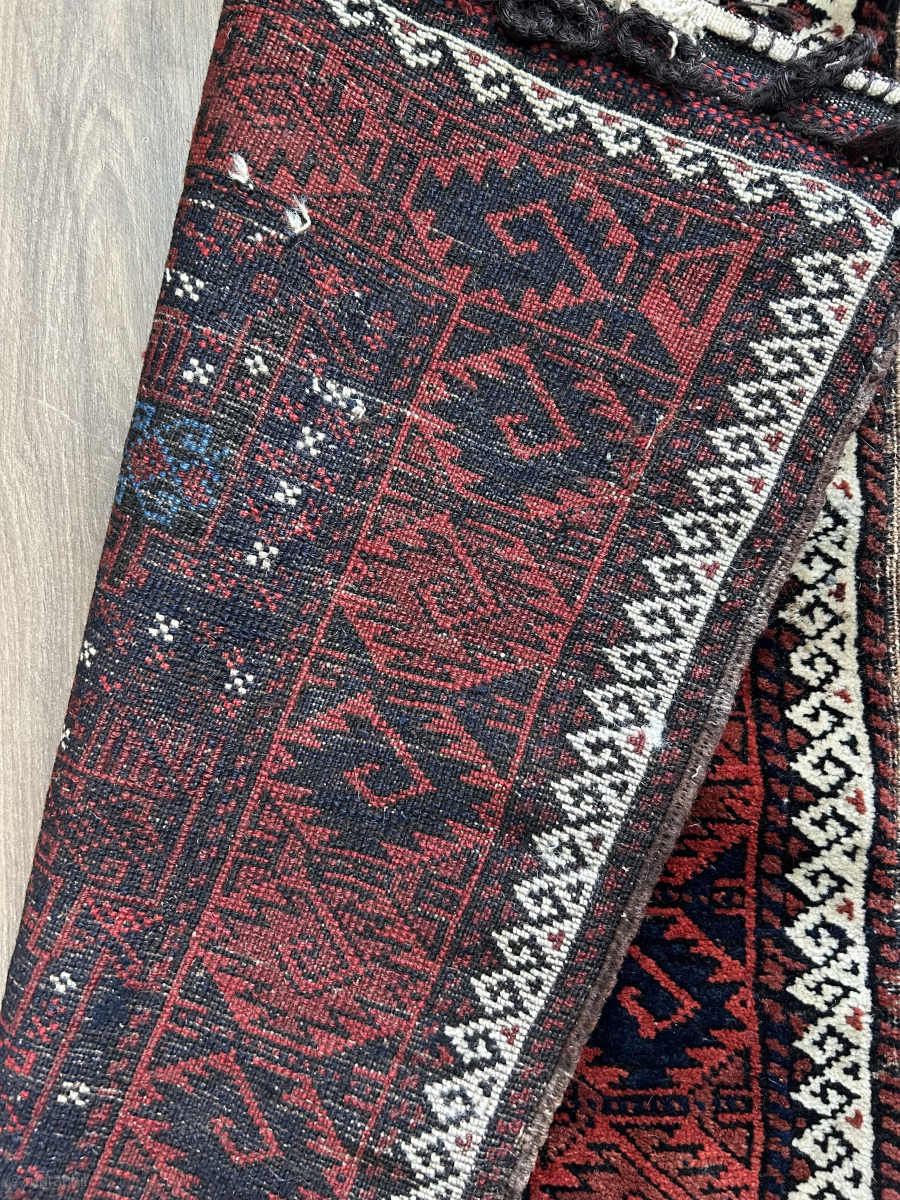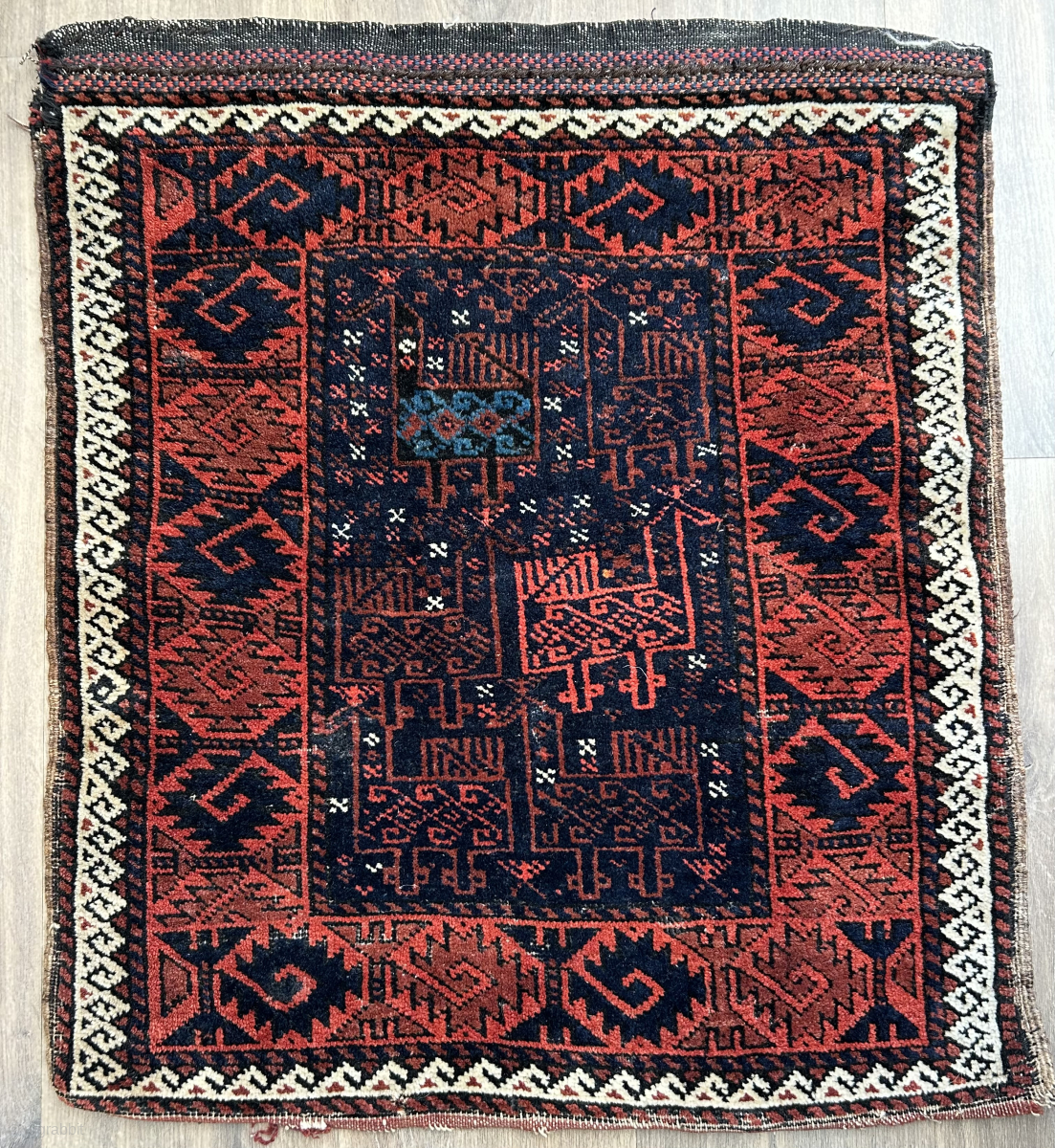 Unusual antique Baluch bird bag late 19 c. Full pile couple of tiny old repairs and needs a clean. Looks like there’s bird is trying to run away ! Size 73 x 63 cm. Available