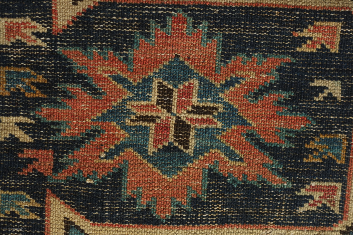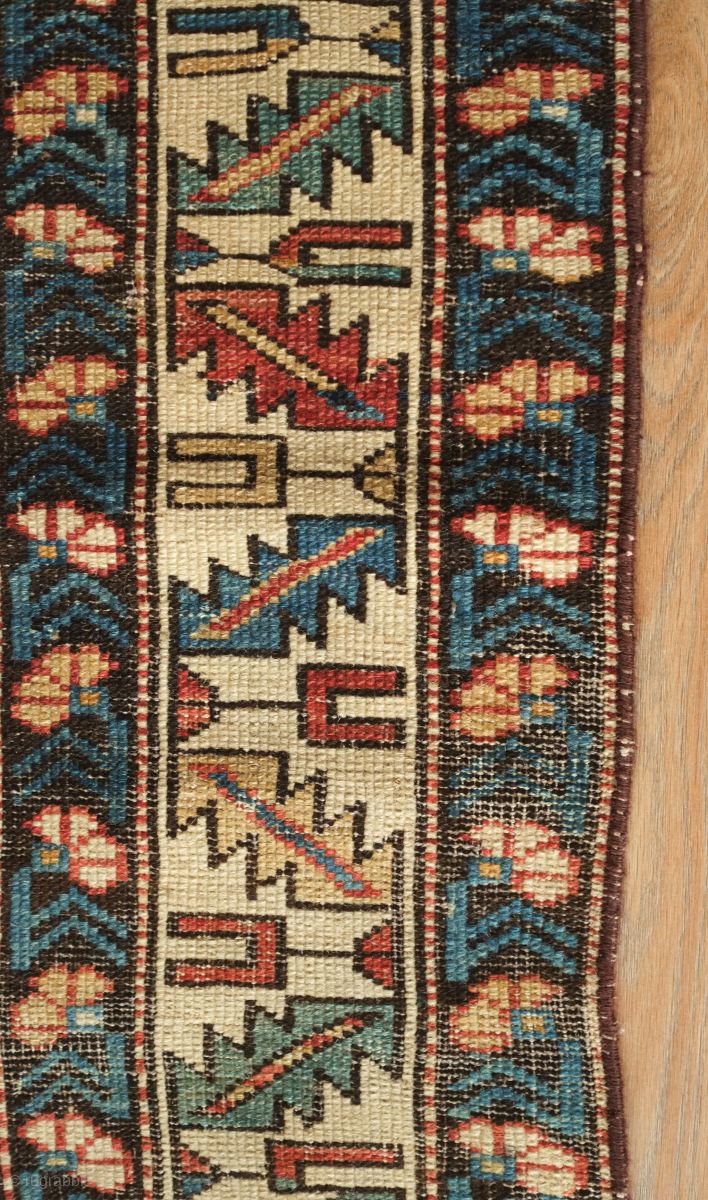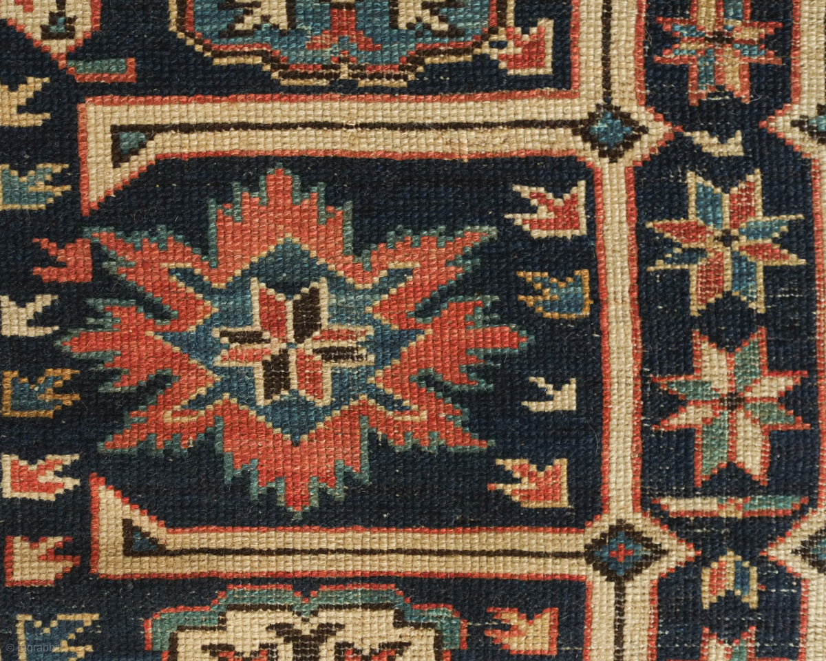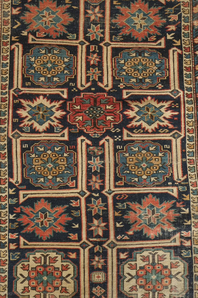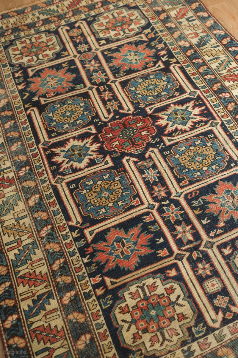 Kuba rug, 19th century. Wonderful floral star and blossom motifs between lattices. Lower pile and some wear but all there and visible. Crisp drawing. Intriguing little motifs interspersed in the negative spaces. 122 x 182 cm. Contact danauger@tribalgardenrugs.com