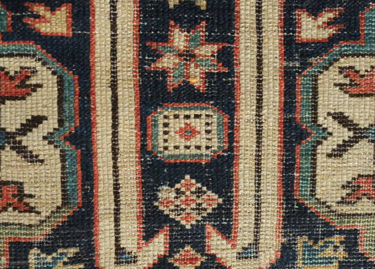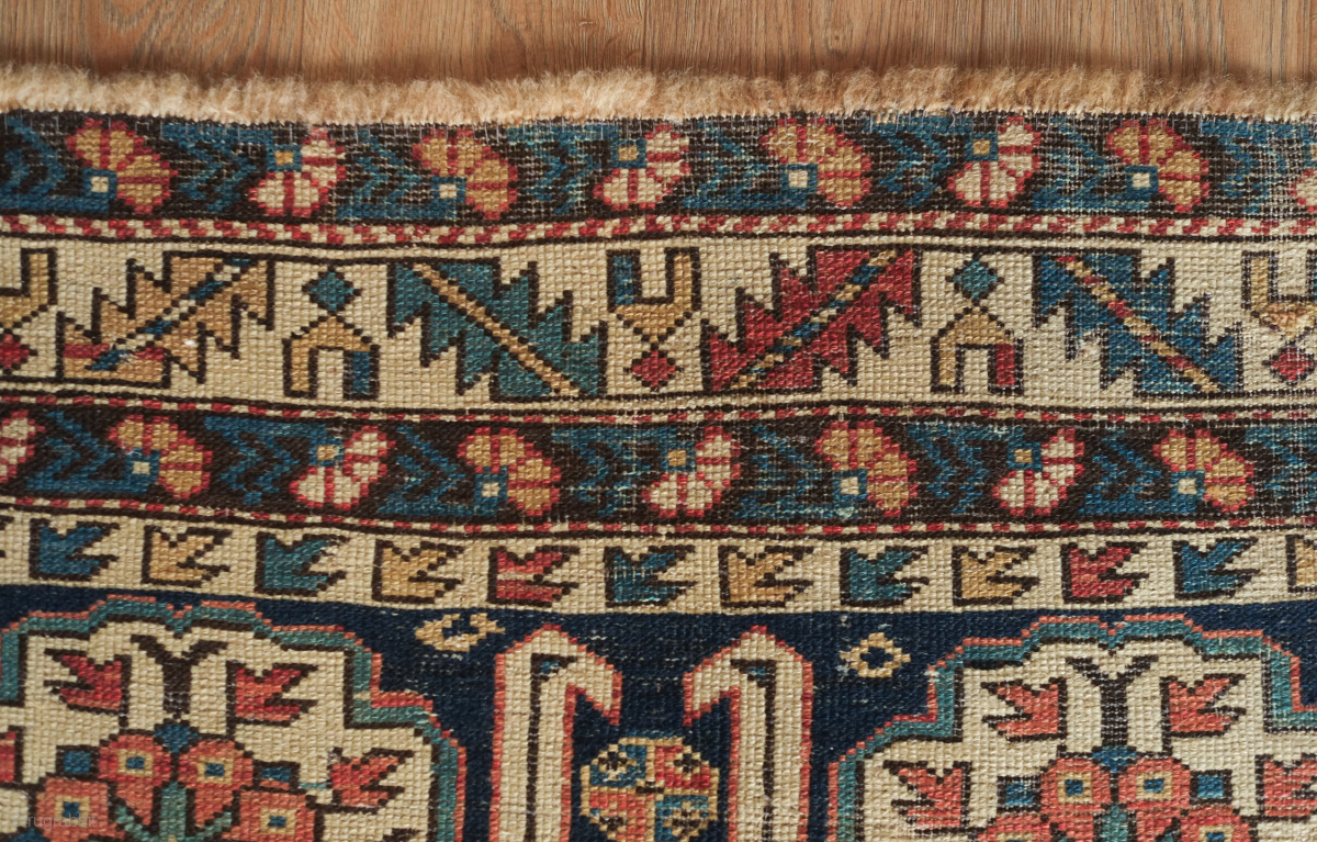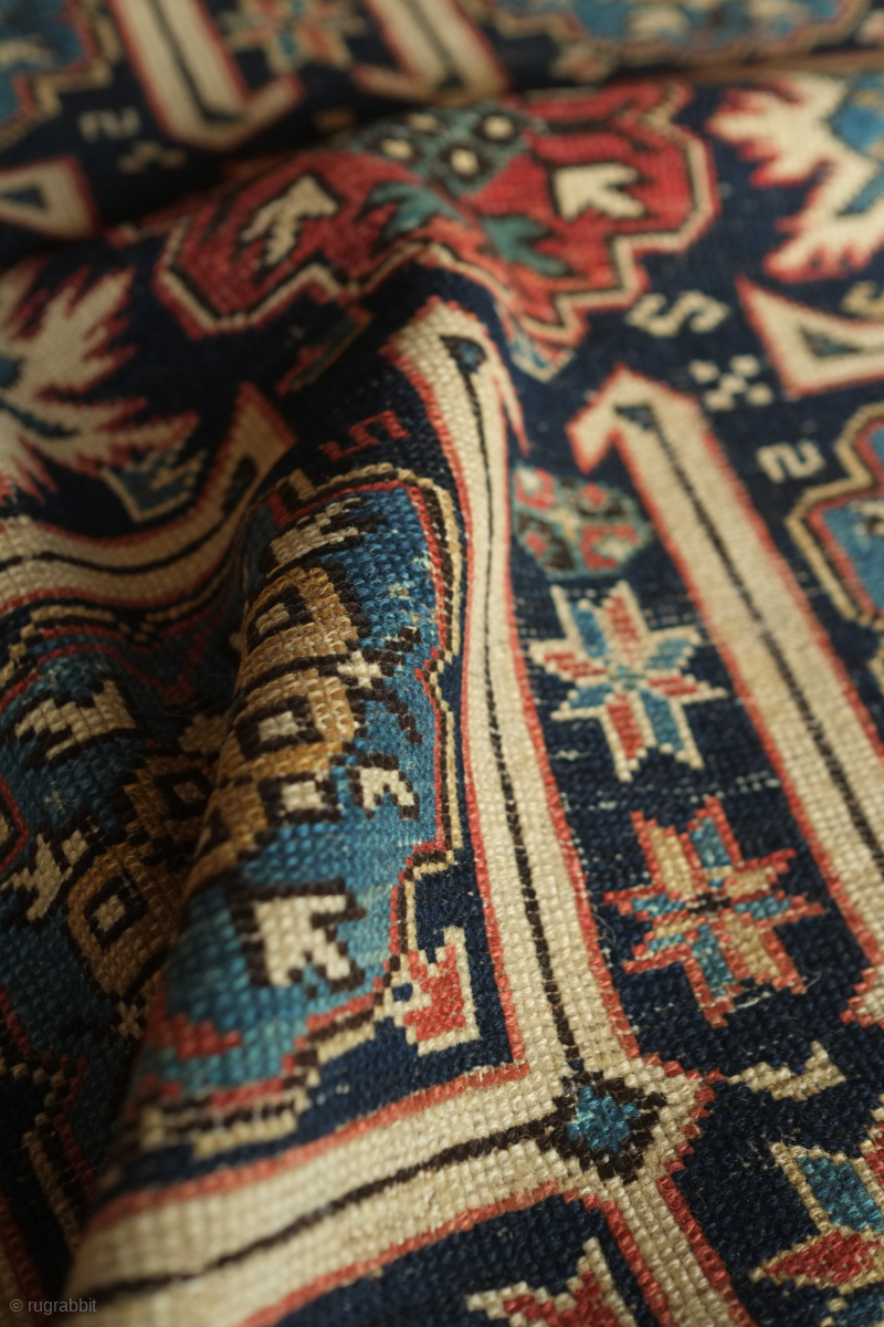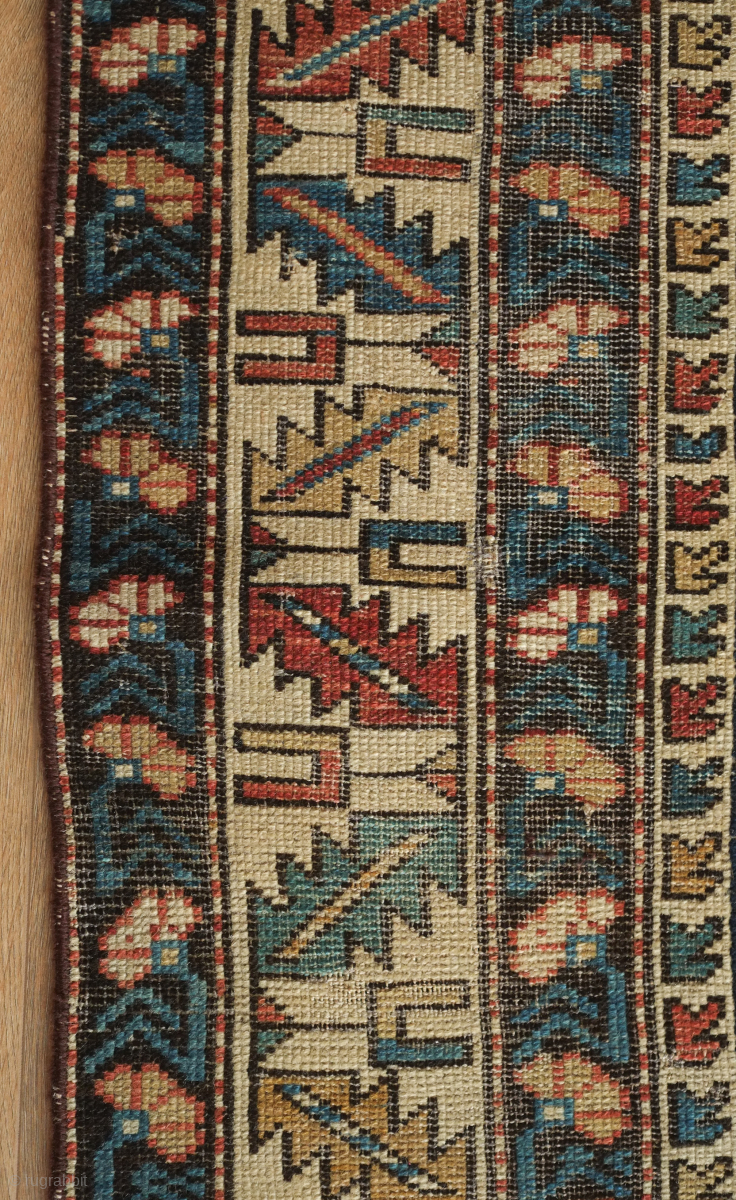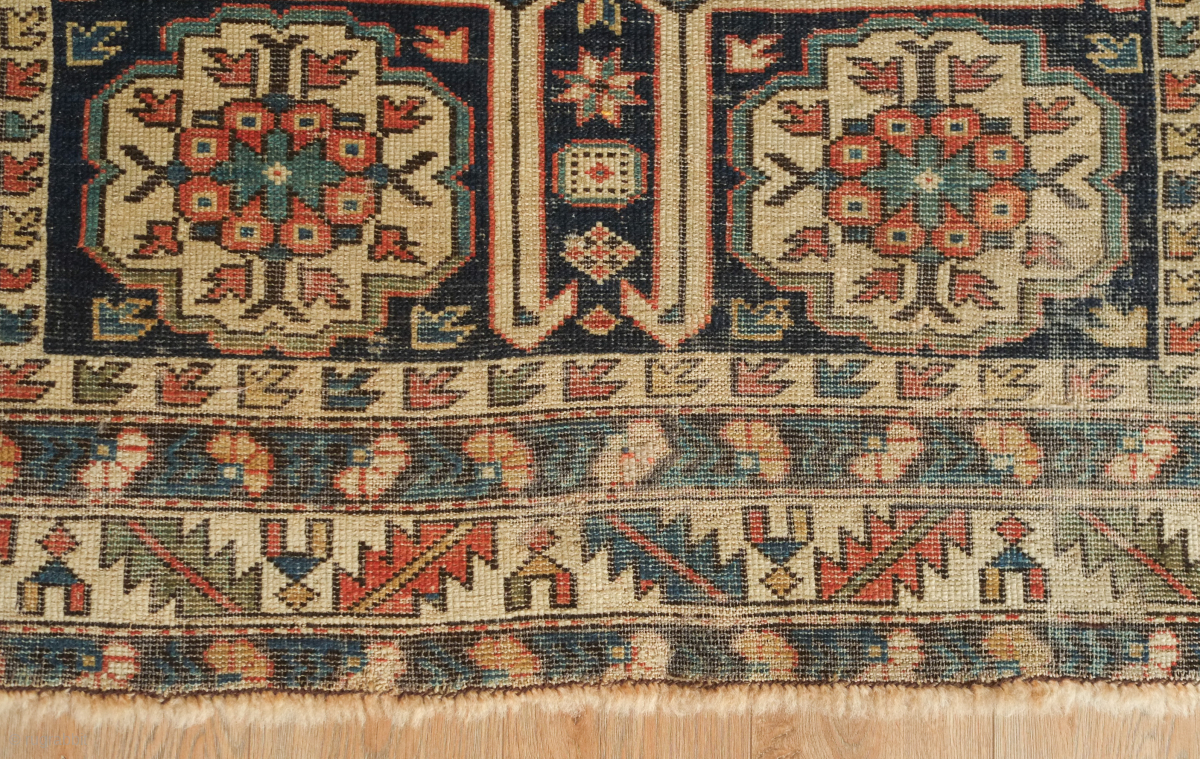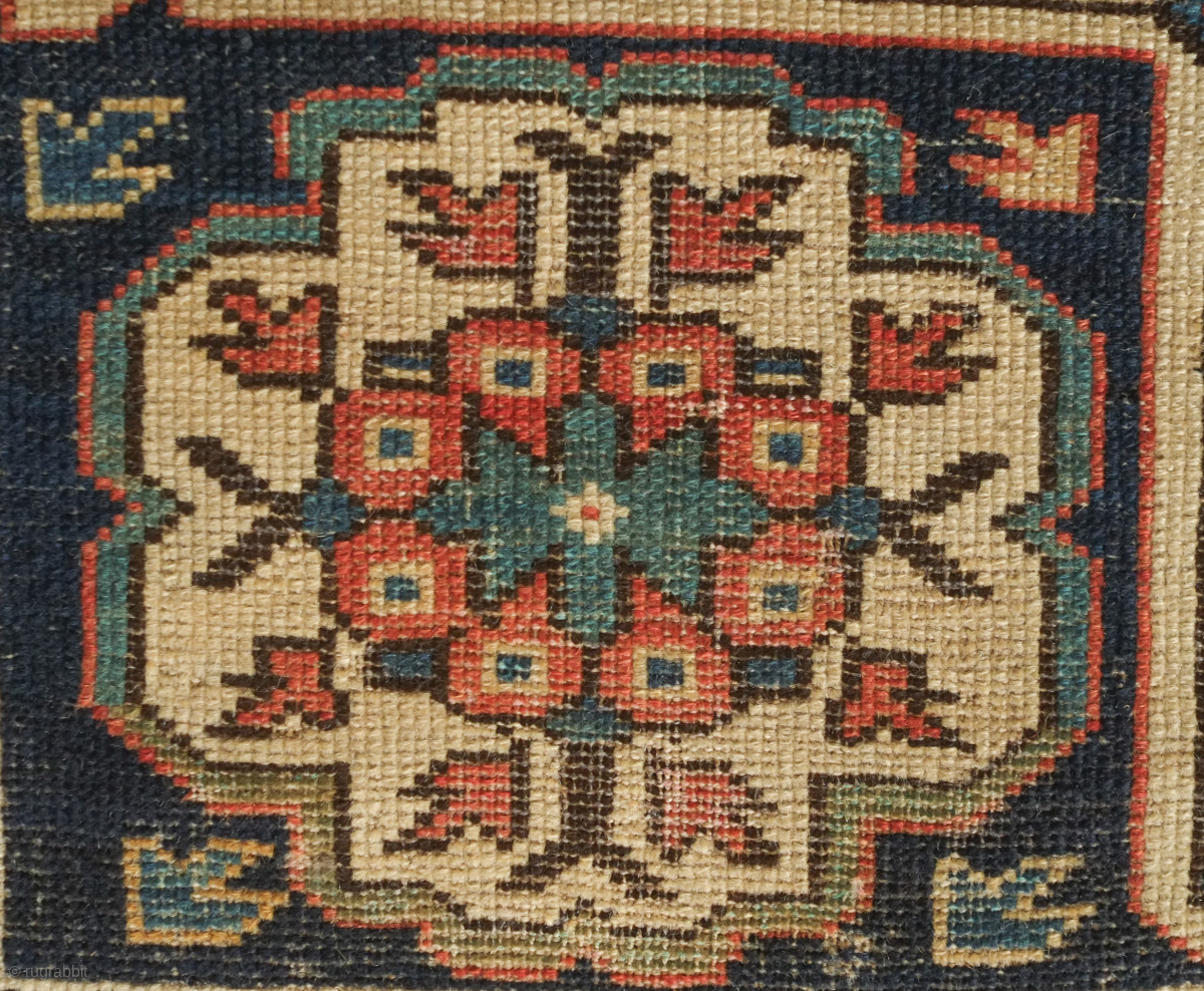 Kuba rug, 19th century. Wonderful floral star and blossom motifs between lattices. Lower pile and some wear but all there and visible. Crisp drawing. Intriguing little motifs interspersed in the negative spaces. 122 x 182 cm. Contact danauger@tribalgardenrugs.com