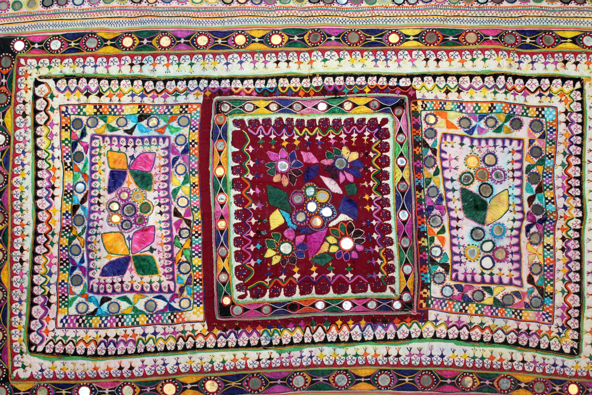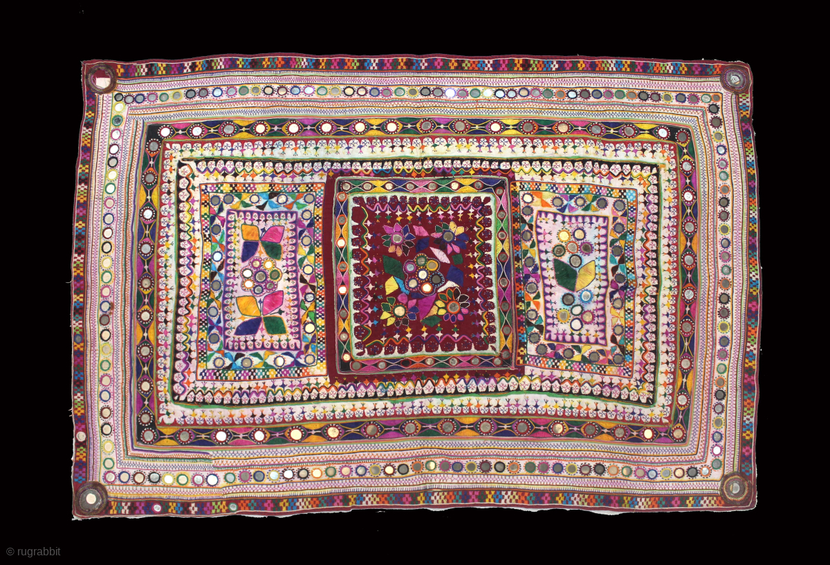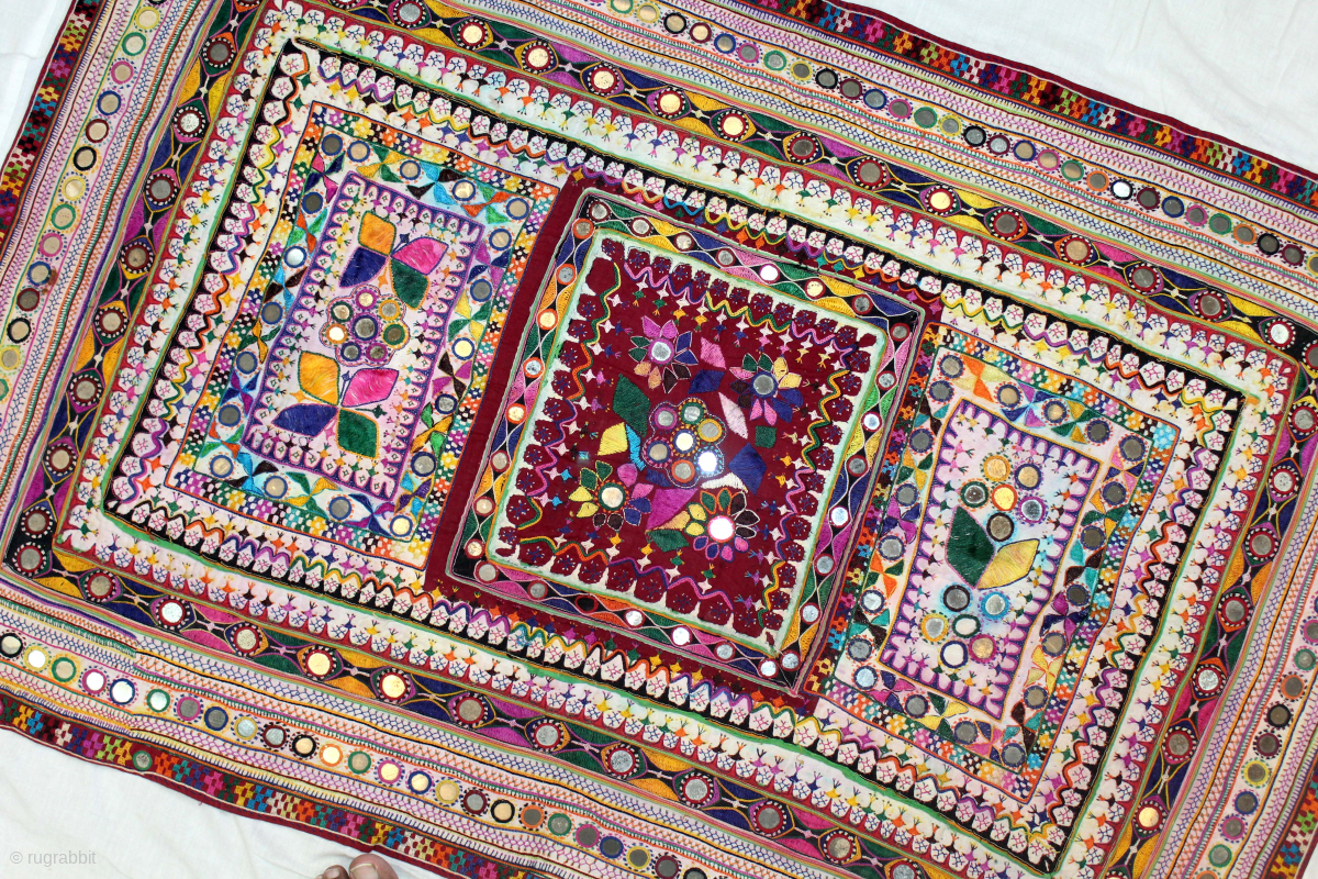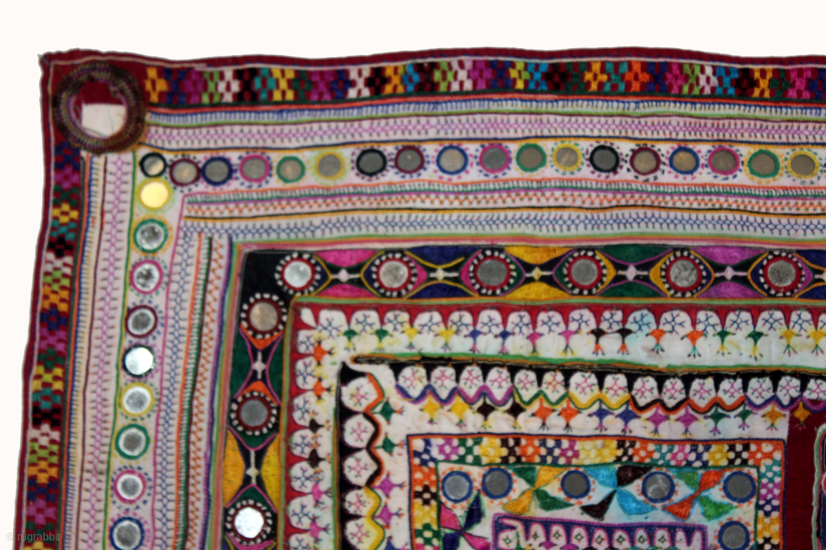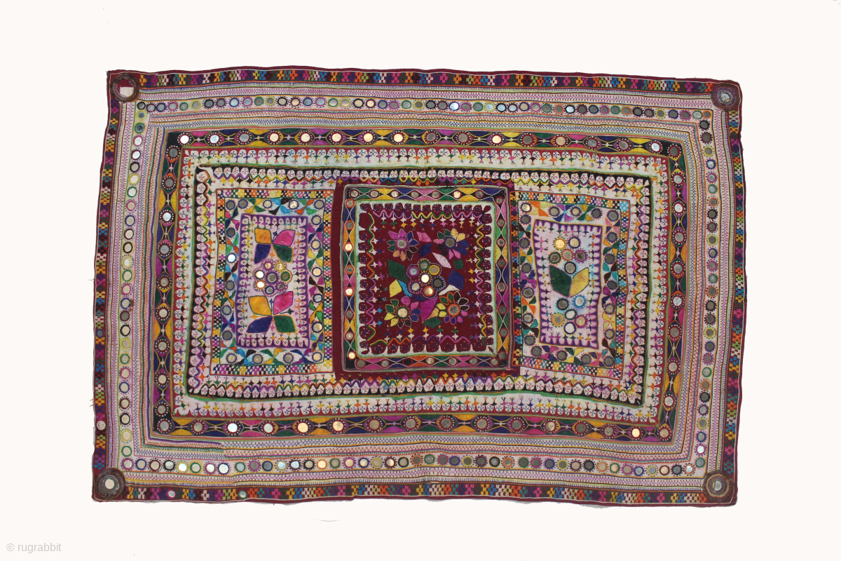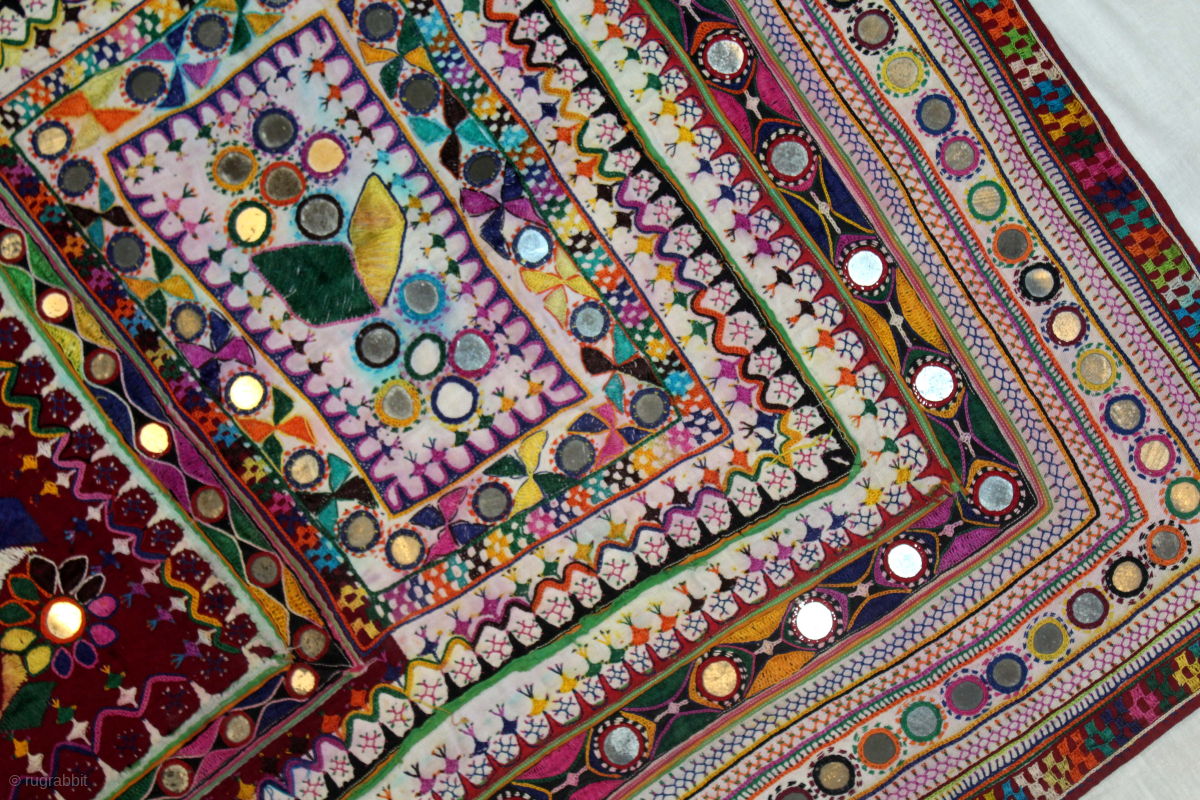 Baby Quilt Embroidered and Appliqued work Made by Gadhvi (Chaaran) Community of Dwarka region of Saurashtra Gujrat India. Very Fine Mirror and Patch work on edges and Running stitches all over. Very unusual and rare to find such quilts .Its size is 76cm x 116cm.