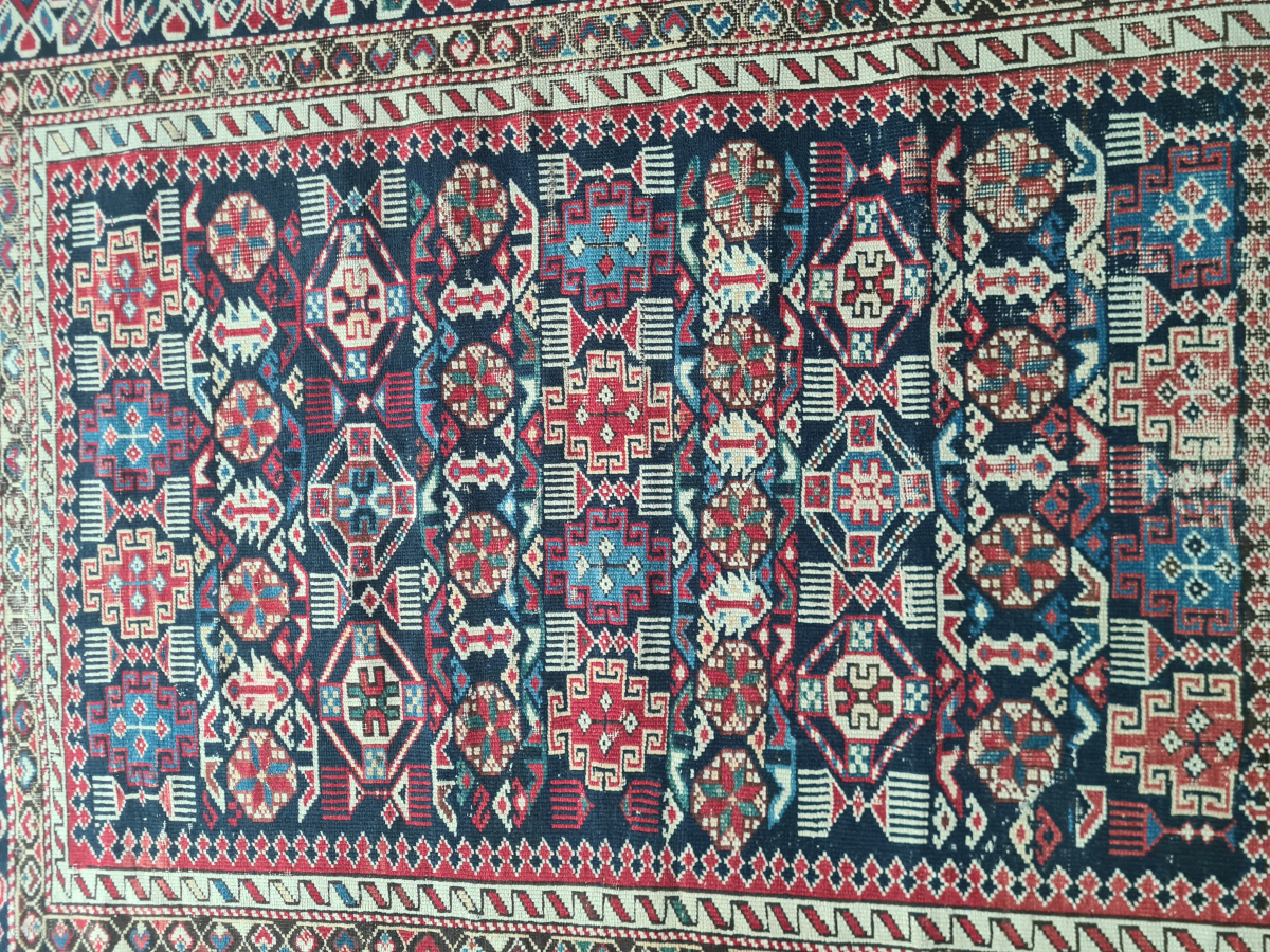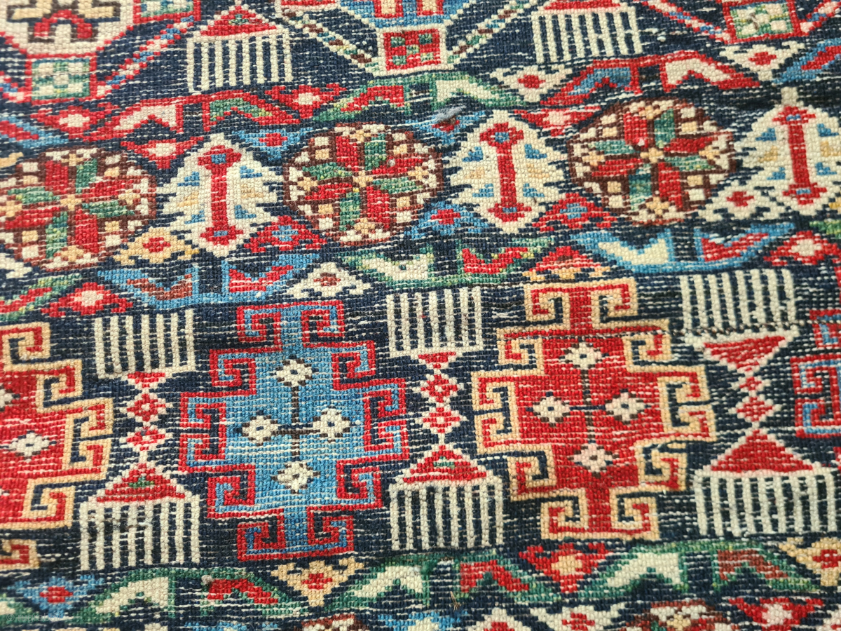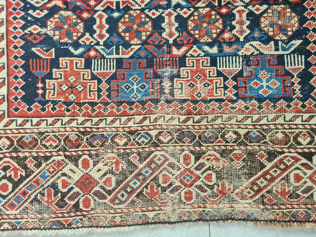 Antique Caucasian Kazak Chichi rug with beautiful natural colors. Low pile and signs of wear (see photos). The dark wool is corroded/oxidized with age. Nevertheless, a great example of its class. Dimensions: 117 x 144 cm Age: ~ 1900 or before