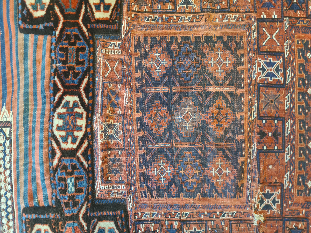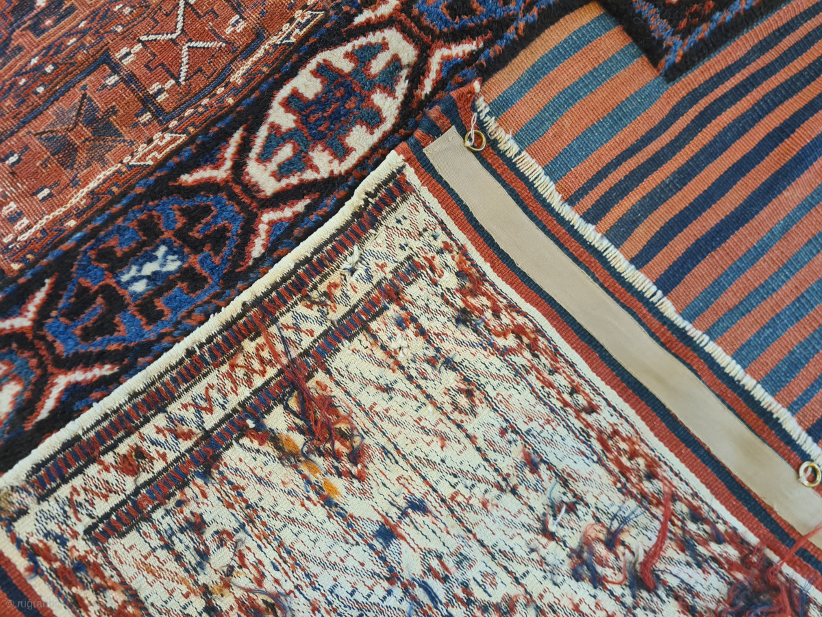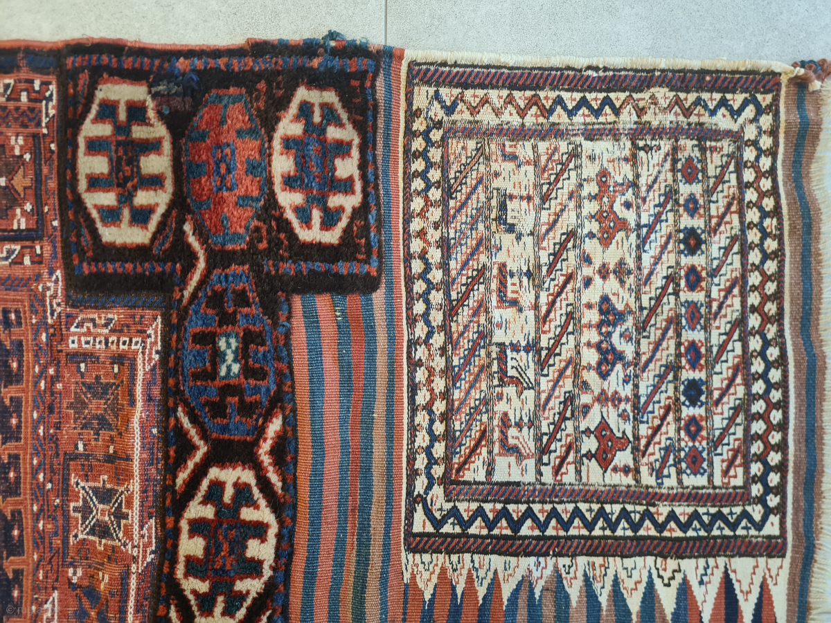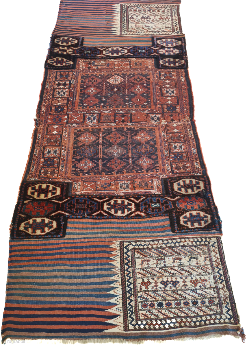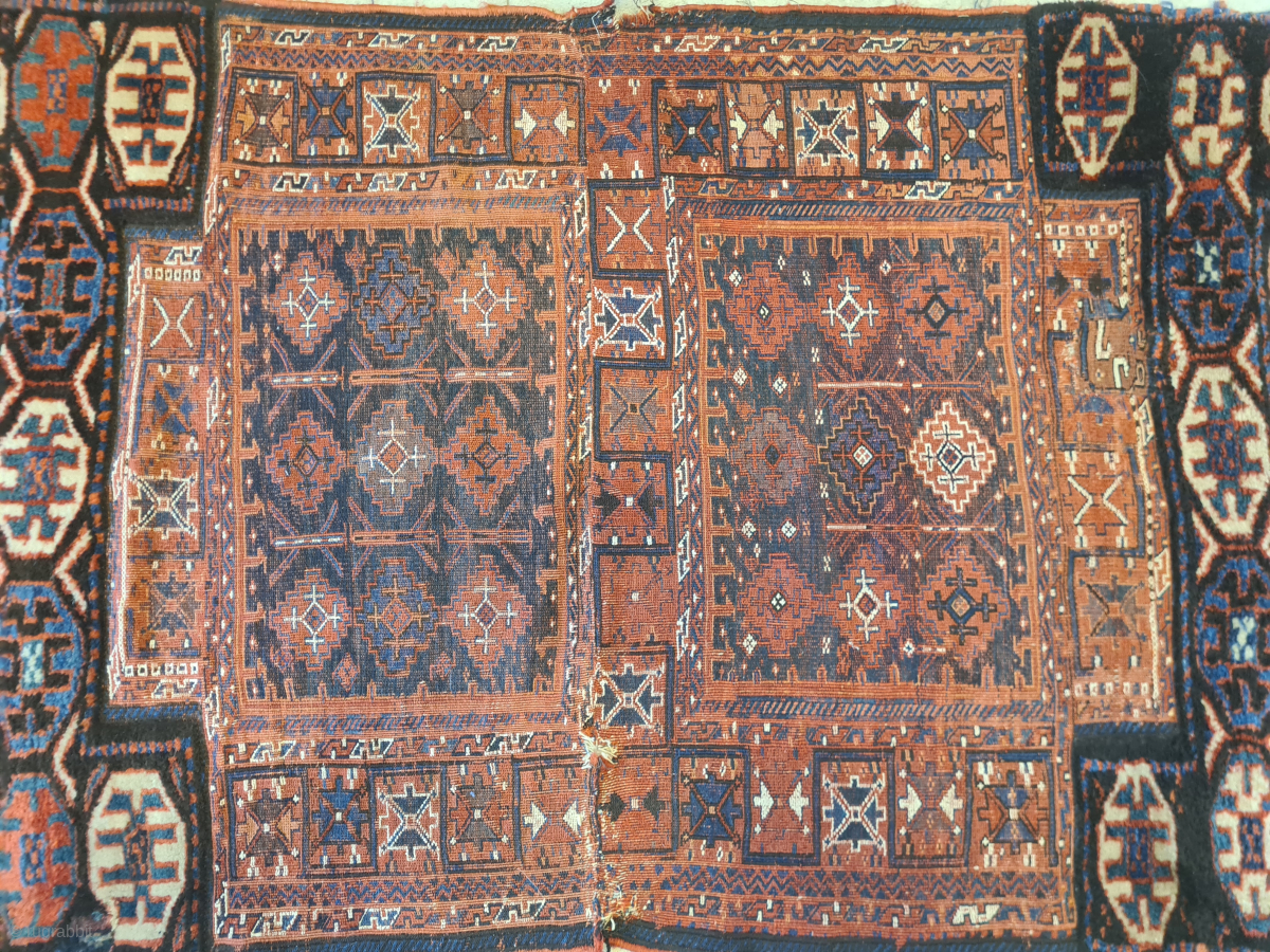 Antique opened Bakhtiari saddlebag/camel bag, made using three techniques (kilim, sumakh, and knotting). The piece has charm: lovely animal motifs on the white areas. Plant-based dyes. Dimensions: 240 x 93 cm. a few small areas of damage (see photos), but overall in good condition for the age.