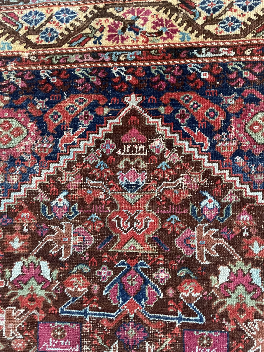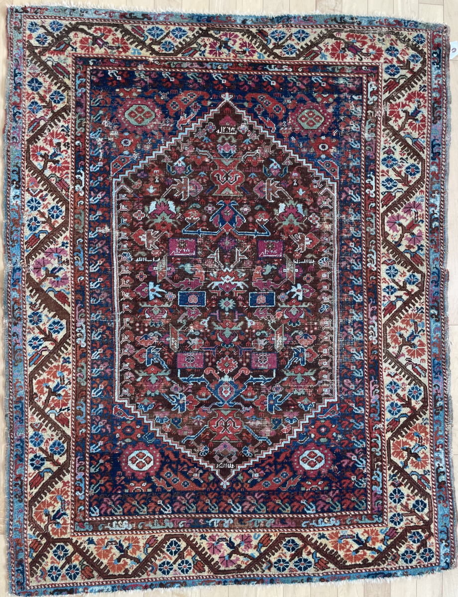 4'5" x 5'8" Demirci Kula, recently cleaned, lots of darning and rough spots but still has the look and spirit. a few inscription and date panels. #14152