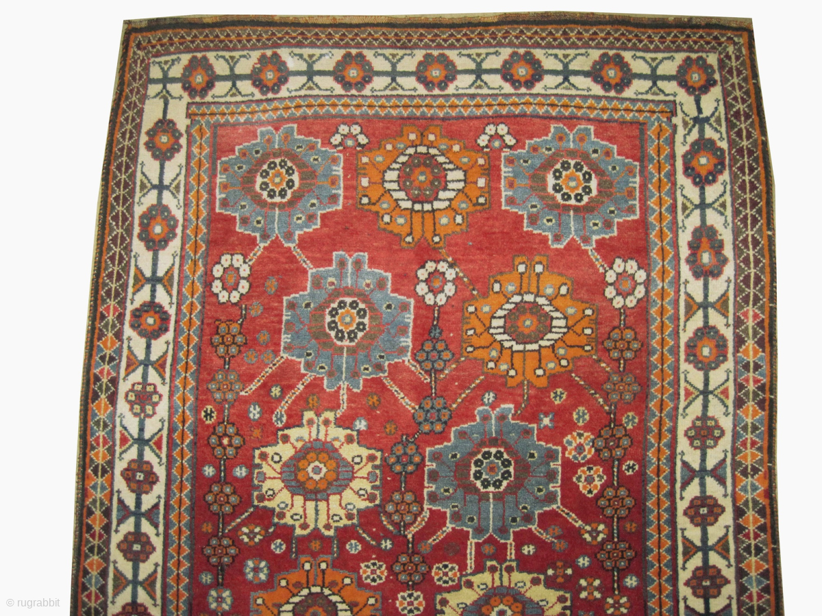 The warp and the weft threads are mixed with wool and goat hair, the knots are hand spun wool, vegetable dyes, the black knots are oxidized, the shirazi borders are rolled on one line with two different color wool, the edges are finished with tiny kelim, the background color is rust-red, the surrounded large border is ivory, thick pile, in perfect condition, high standard quality.