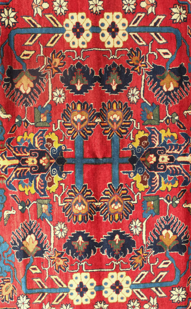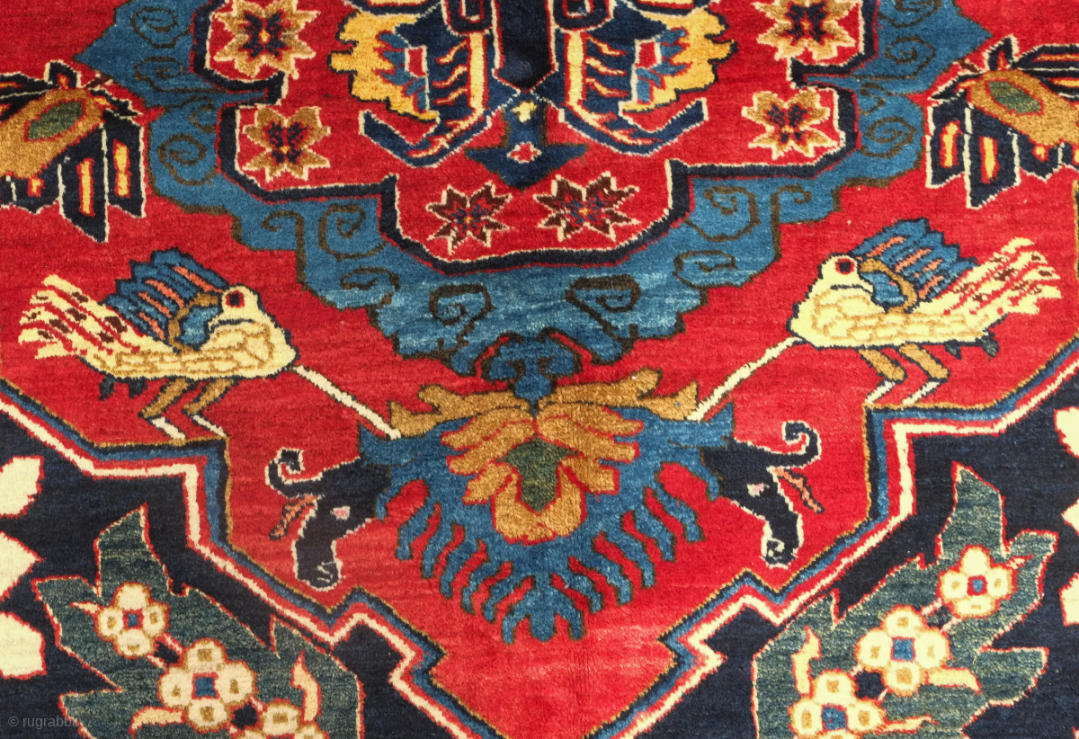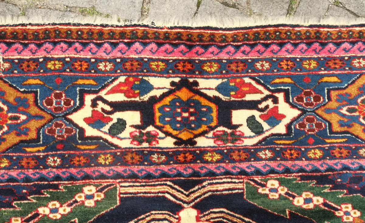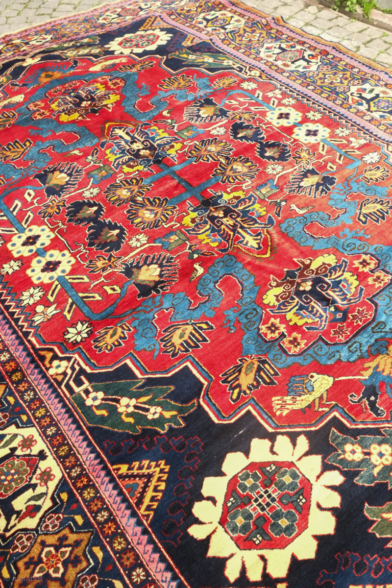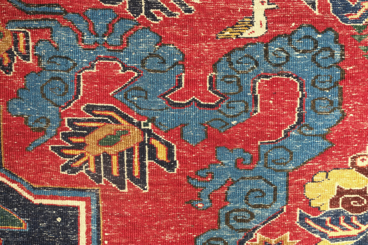 Shirvan cloud band carpet, early 20th century. This beauty is a real gem. The cloud band is finely drawn preserving the detailed style of early cloud band rugs. The colors and wool are stunning. Birds and mythical animal heads abound. 216 x 356 cm. Contact danauger@tribalgardenrugs.com