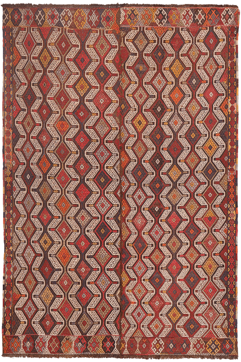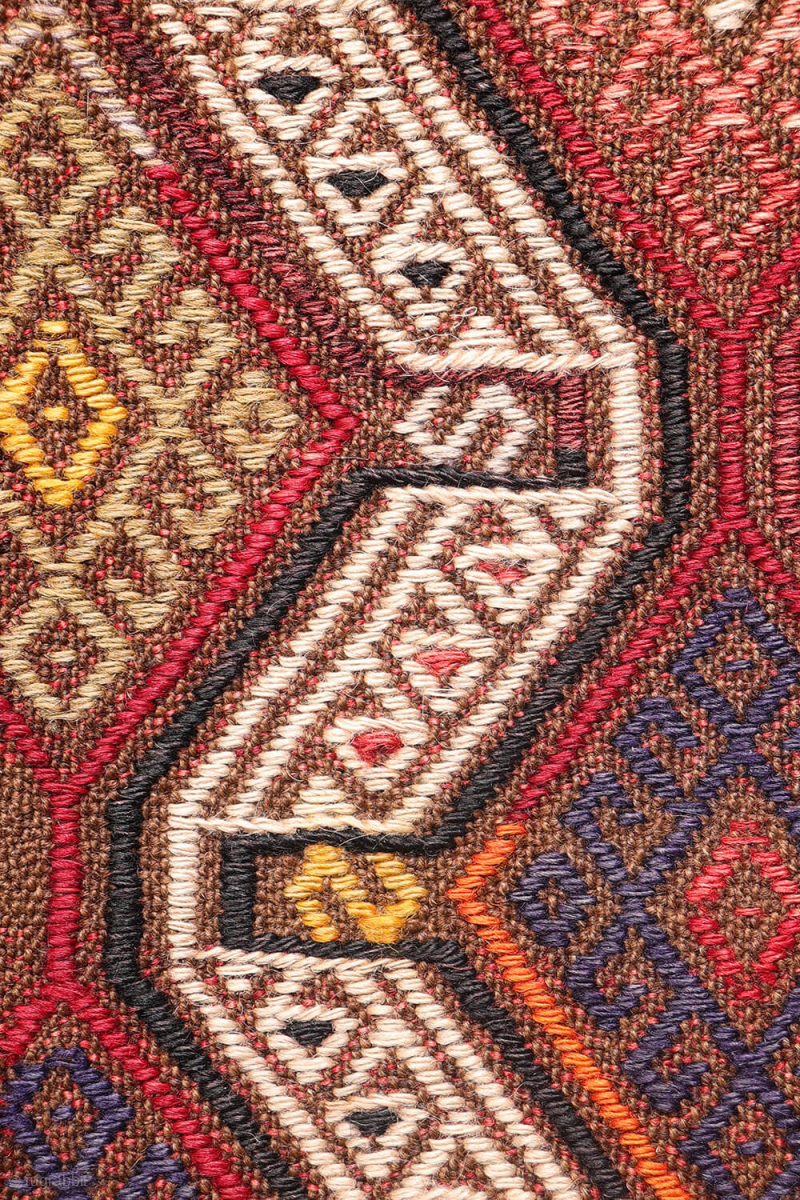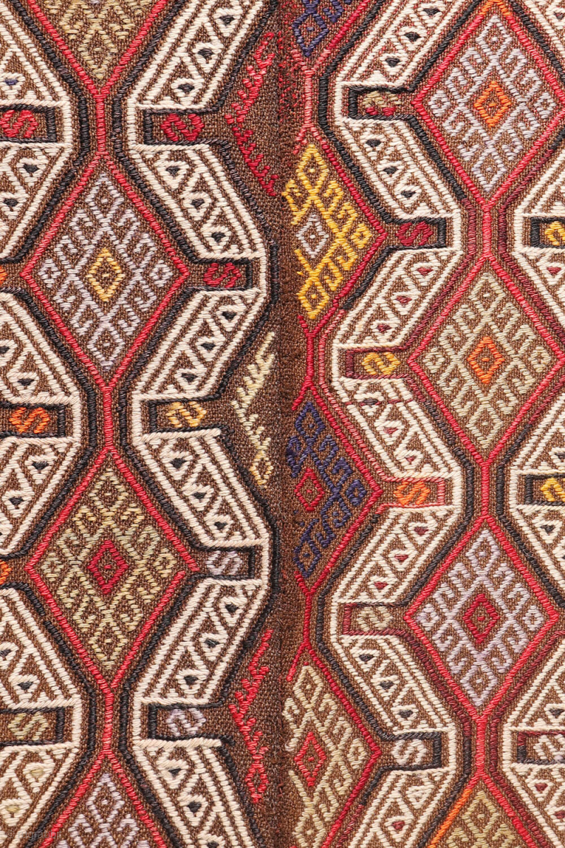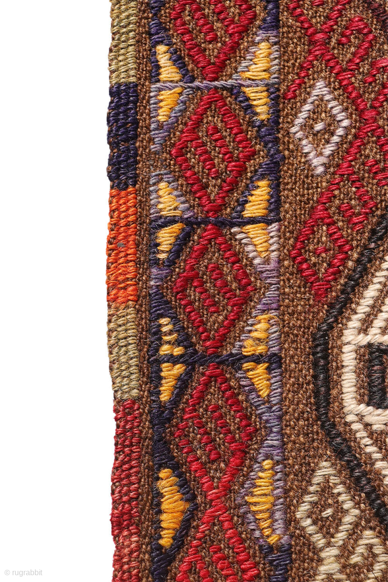 This Adana kilim is woven on an undyed brown wool background and decorated using the cicim technique. While the weaver created a repetitive pattern, she introduced subtle variations by randomly arranging the colours within each motif, breaking the symmetry and adding a lively, dynamic feel.
