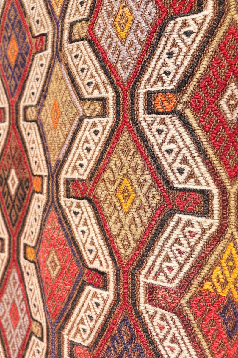 Due to the limited width of her loom, the weaver crafted two long strips and joined them in the middle to achieve the full size of the kilim.