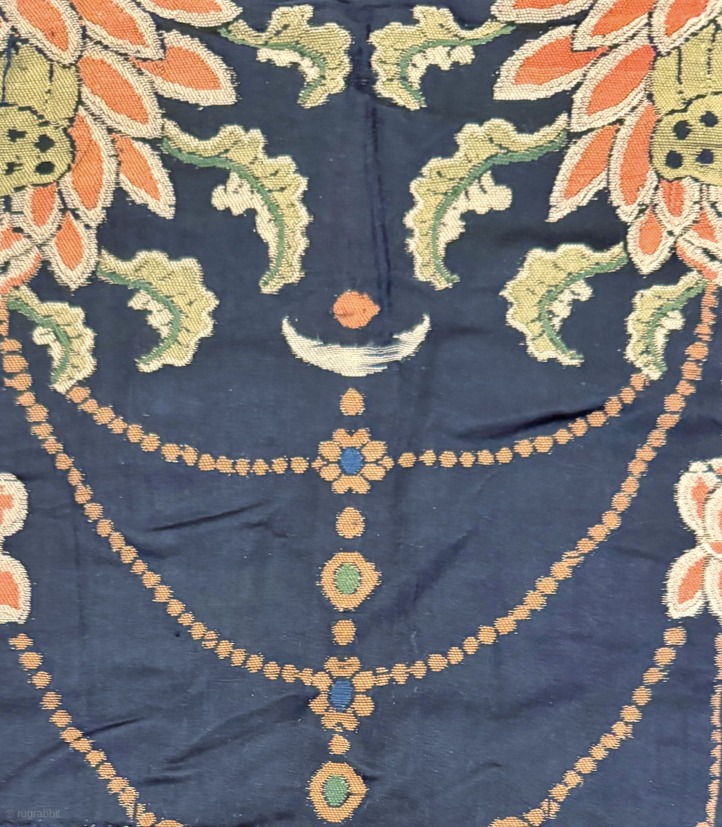 An exceptional and rare antique Chinese silk brocade textile, from late 17th century / Early 18th century Emperor Kangxi Period of Qing Dynasty or slightly earlier from the late Ming dynasty. It was part of a Buddhist dance robe patterned with skulls, flames, snakes and lotus flowers surrounded by ornament in spectacular colours against the beautiful indigo ground. The fine quality of the weaving suggests that it was made for the courts. Textiles as such would later, under Kangxi’s son emperor Yongzheng would be donated to Buddhist monasteries which would repurpose them into put together fragments as alter hangings. Yongzheng in particular was a patron of Buddhism and under his reign many textiles of China found its way to Tibet. a great piece worthy of any top collection and offered at a fair price. 61cm x 51cm (24” x 20”) …….. (If you message via rugrabbit and don’t get a response within 24 hours, then your message hasn’t got to us so please email directly to: istalificollections@outlook.com.)