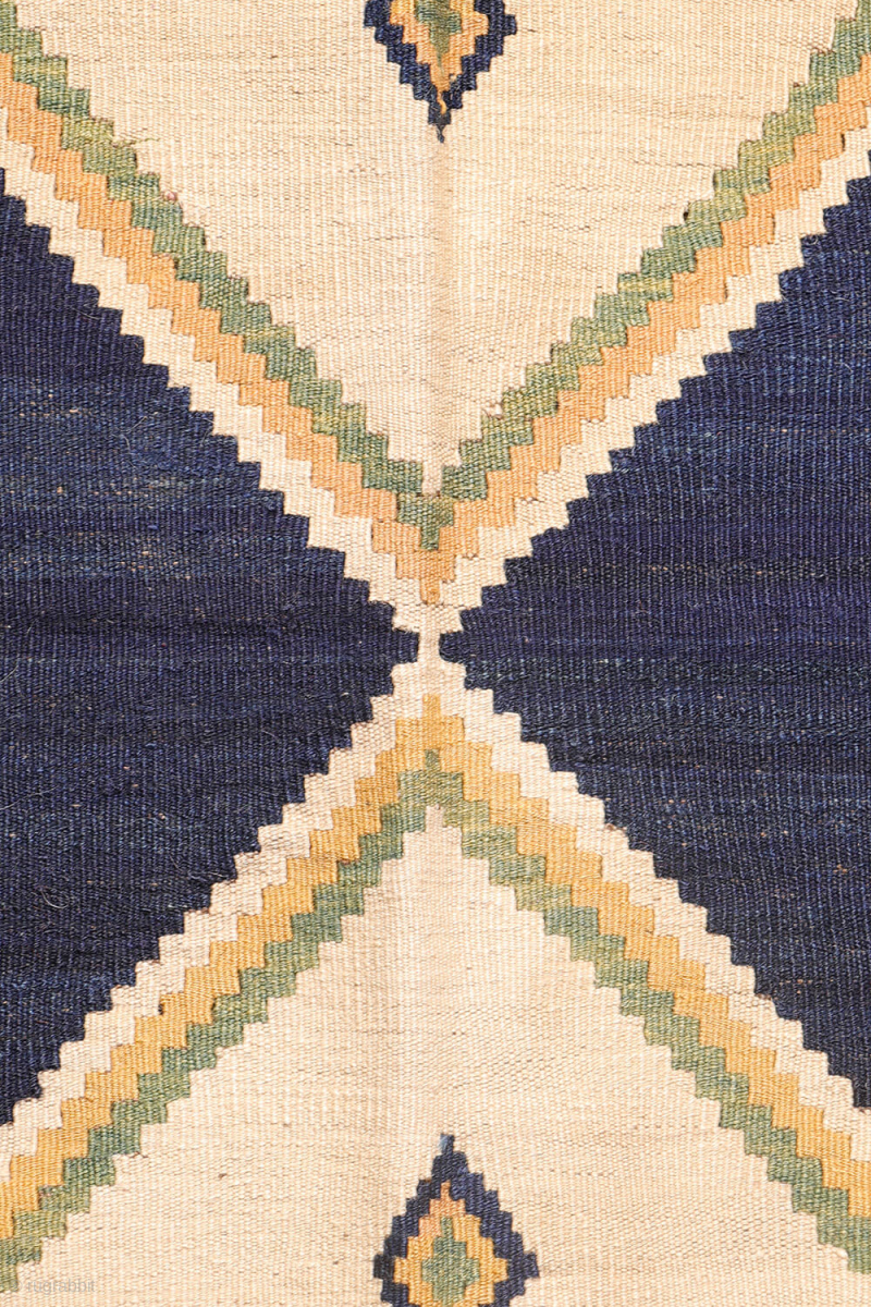 This remarkable 1920s Qashqai kilim is distinguished by the predominance of dark blue, achieved entirely with natural dyes. The weaver created a simple yet visually striking design by placing just two oversized medallions in the central field and leaving the surrounding space open. The dramatic effect is enhanced by the contrast between dark and light tones.
