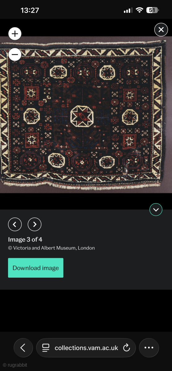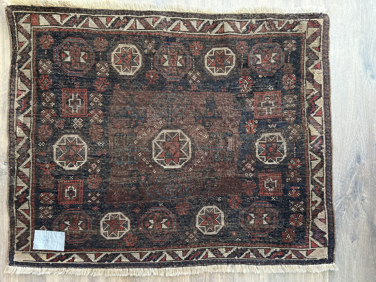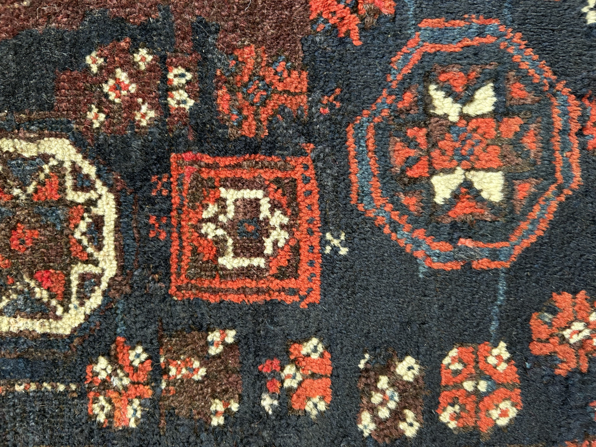 Early Baluch bagface with “ box” border mid 19 c or before. There is an example of this type in the v&a museum London purchased in the 1876 as antique. They have various old repairs so priced accordingly but a very rare type this is only the second i have had. 88 x 72 cm. Available