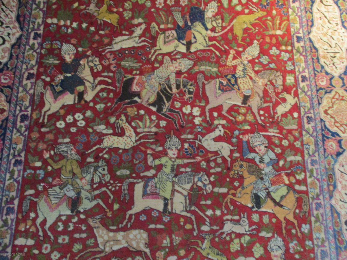 #7383 Tabriz antique Persian rug 'Hunt Scene' This circa 1910 Tabriz measures 4’2” x 6’3” (128 x 192 cm). It has a hunting scene on a tomato red ground completely filled with Persian hunters on different colored horses hunting antelope, deer, goats, lions, rabbits, elans and kudus with various implements of destruction including swords, knives, bows and arrows, and spears. All is encompassed with a medium blue border containing cartouches filled with Farsi script which i suppose is probably a poem. The rug has full pile. The ends and sides are complete. It is clean and ready to go. The buyer pays the shipping with insurance.