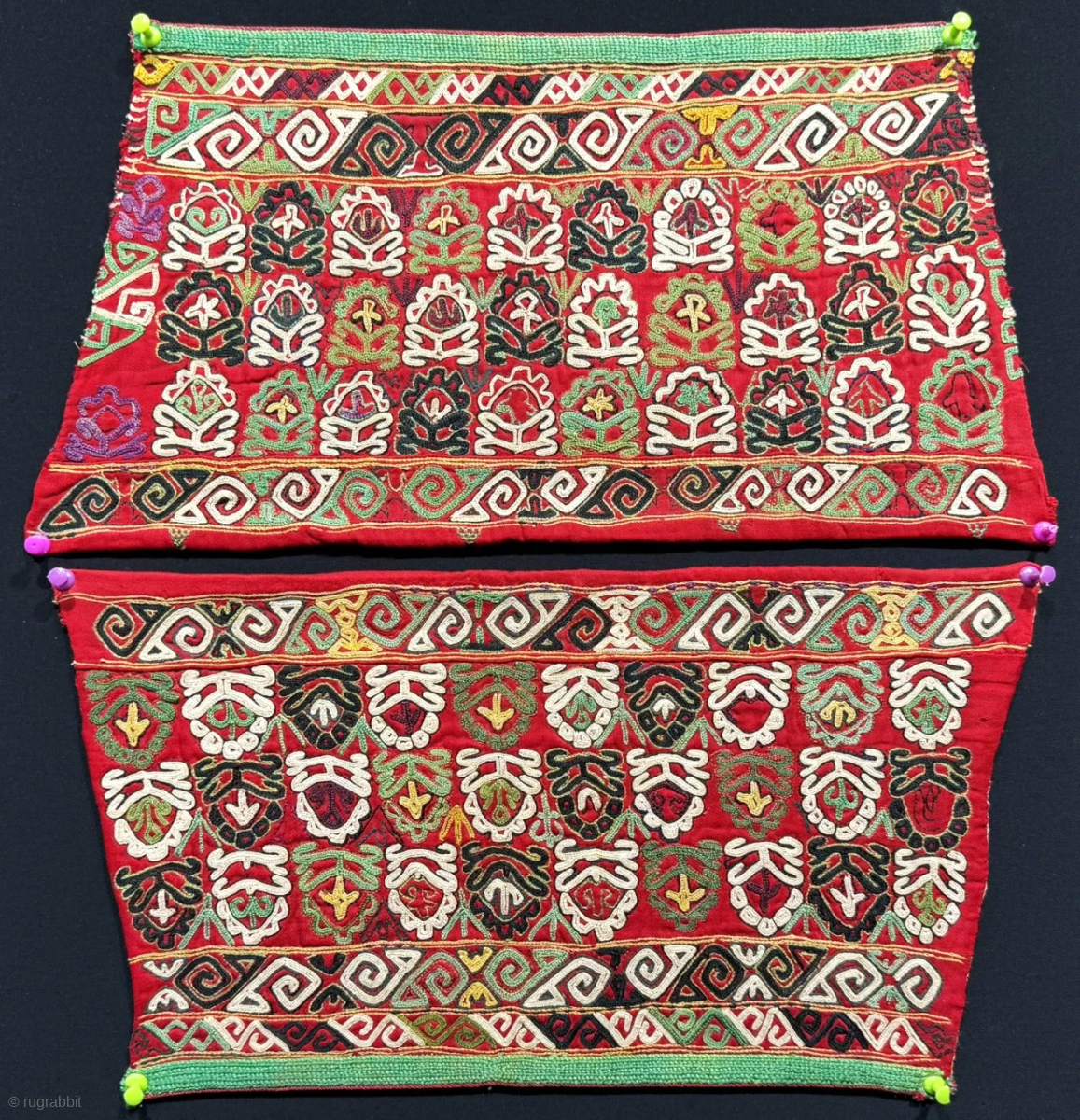 Antique Turkmenistan - Turkmen Chodor Tribal Robe Chapan Cuffs. Fine chain stitched embroidered wtih traditional Chodor talismanic design. Fairly in good condition. Size - 12.5'' x 15'' x 8'' - Top : 32 cm - Lower : 39 cm - Width : 20 cm. turkmansilver@gmail.com.