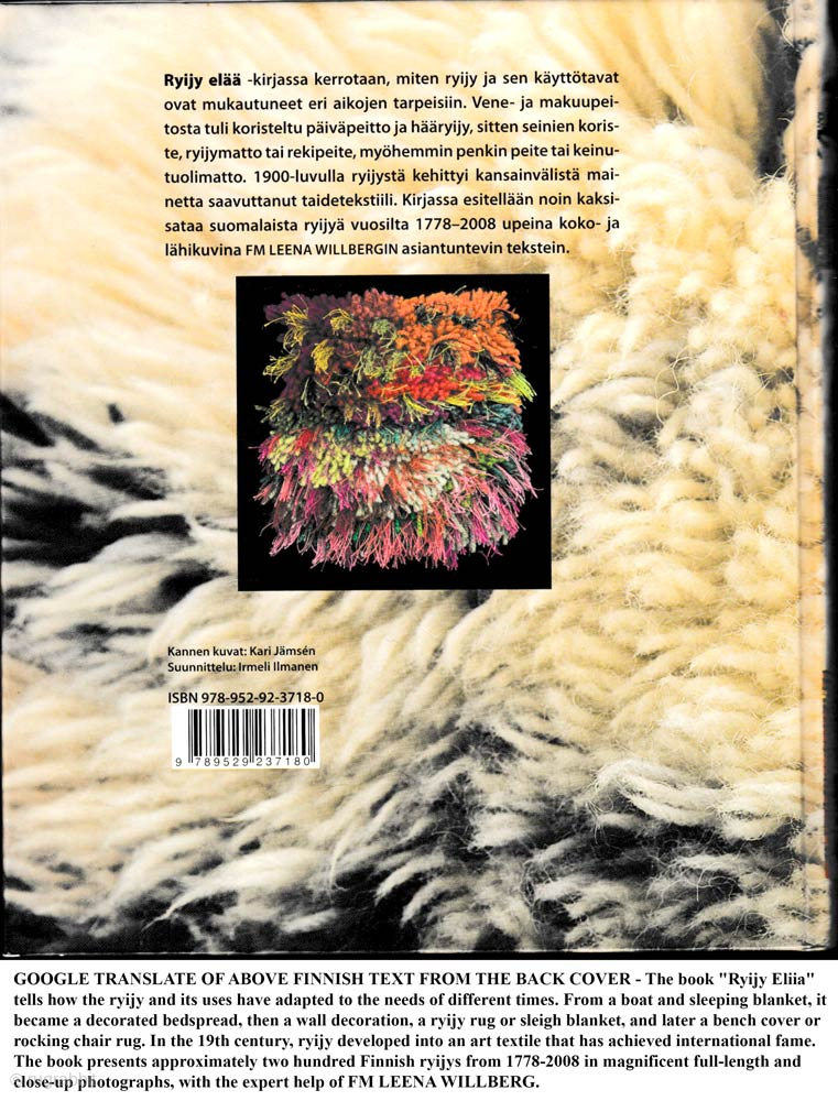 Three hard to find out of print hardcover books on Finnish ryijy’s (rugs) and Swedish flatweaves. One is in English, and two in Finnish. All with a multitude of photographs. Book 1) "Taideryijyja" (or ‘Art Rugs’ in English) by Anja Louhio, published 1970 with Finnish text, covers Finnish ryijy’s in the period 1950 to 1970. Book 2) "Ryijy Elää, Suomalaisia Ryijy’s 1778 to 2008" (or ‘Rug Life, Finnish Rugs 1778 to 2008' in English), published 2008 with Finnish text (and hundreds of photographs), covers Finnish ryijy’s from 1778 to 2008, but concentrating on ryijy’s from the 19th and early 20th century. Although both are in Finnish text they are worth having for a reference just for the photos alone. Book 3) "Flatweaves From The Fjord And Forest" by Peter Willborg, published in 1984 with English text, an excellent reference work covering Swedish flatweaves from the 18th and 19th centuries. All in very good interior condition, with some shelf wear to the dust jacket of #1, and #3 having a scuff to the cover. Can be sold individually, but prefer to sell as all three in one sale, which will also provide the buyer with the best price. Postage will vary depending on destination country and number of books in order. Other books for sale can be see here https://warpandweft.club/portfolio-item/books-for-sale/, and some books that are in our library may also be for sale https://warpandweft.club/reference-material/. Please inquire if you see one there you may want.