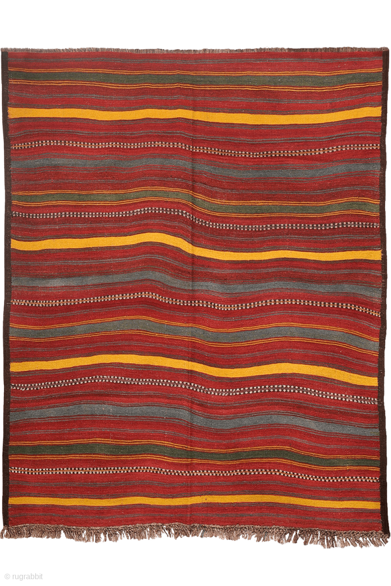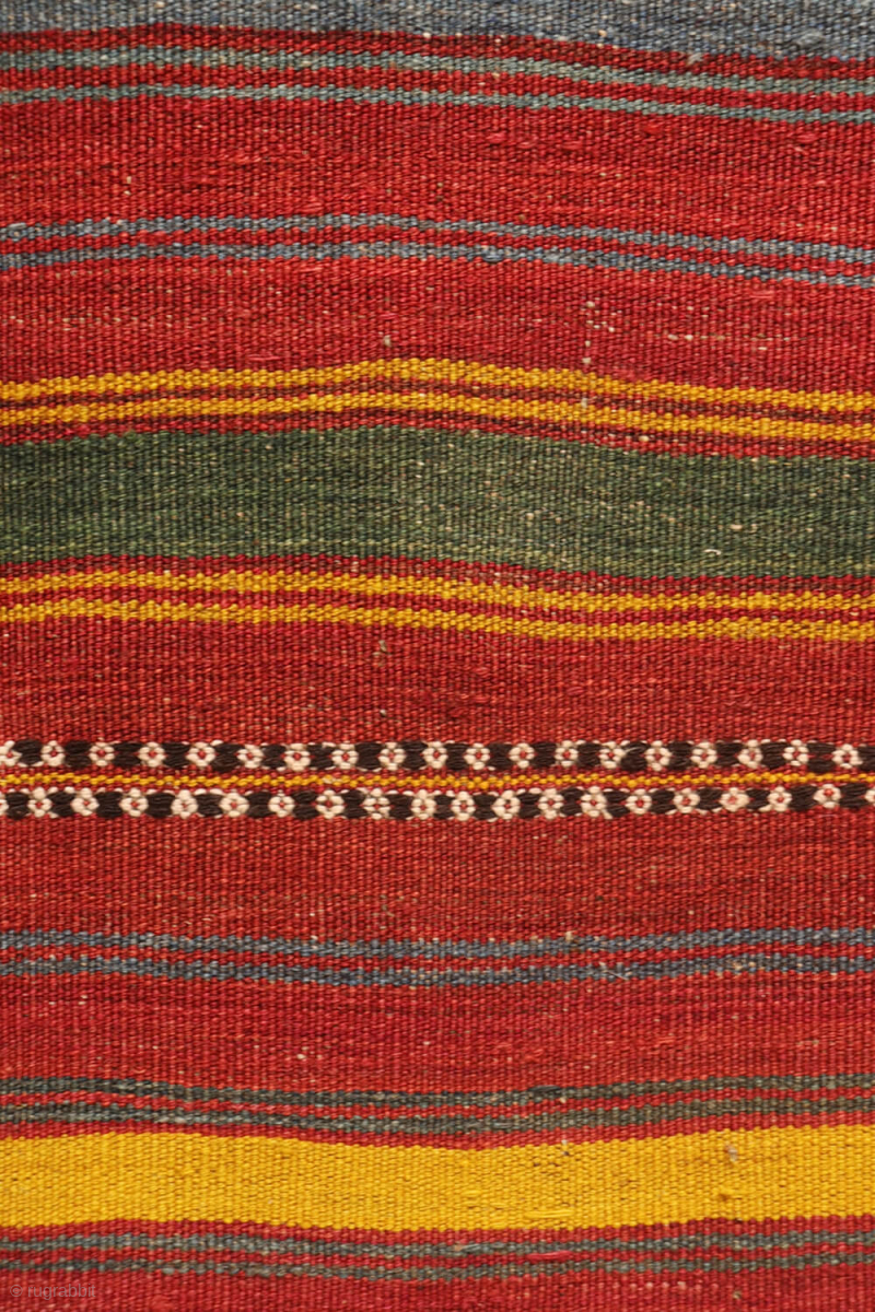 One side retains its original fringes, finished with decorative knotting. All dyes used in this kilim are natural.