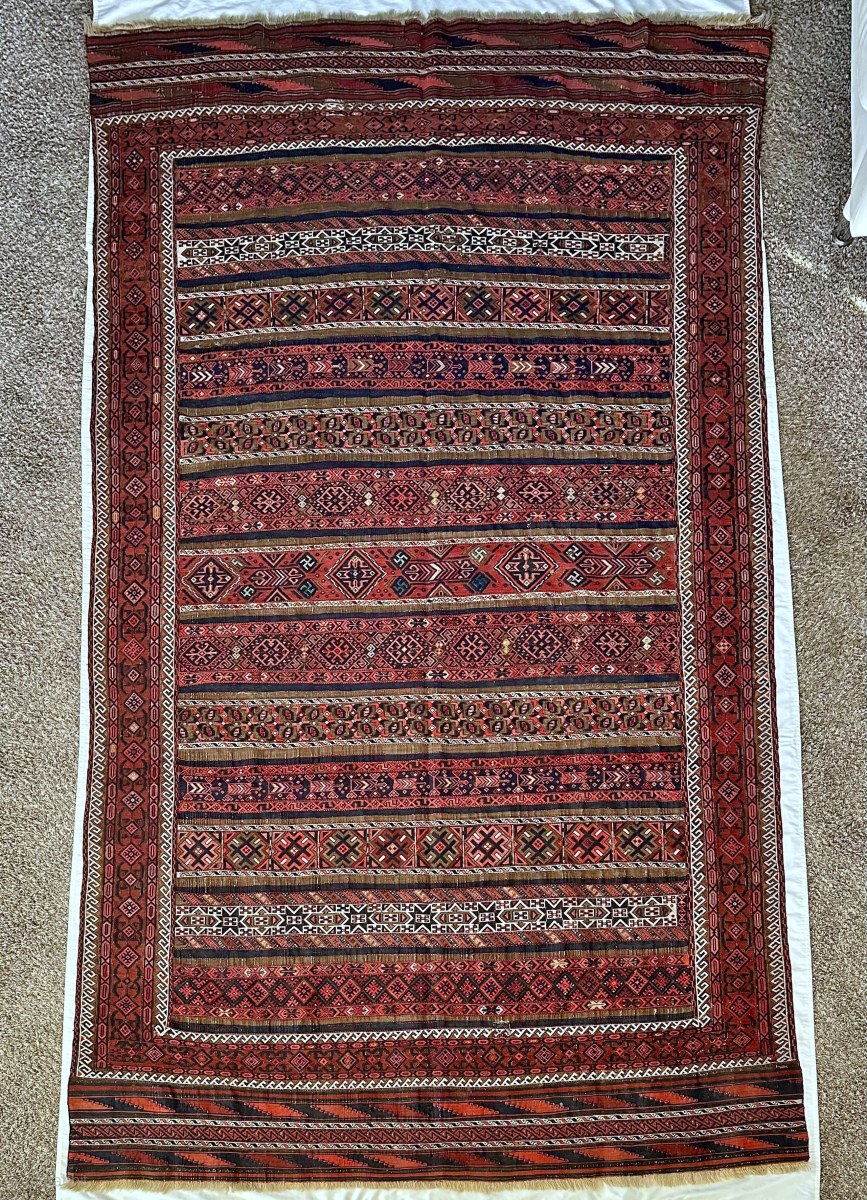 a large and fine soumak Timuri Sangtschuli Baluch rug. 275x165cm. 9'10" x 5'5. 19th century. It has some silk highlights. In overall great condition. Please contact me at Steven.malloch@gmail.com or gerrerugs@gmail.com for purchase or questions. Cheers.