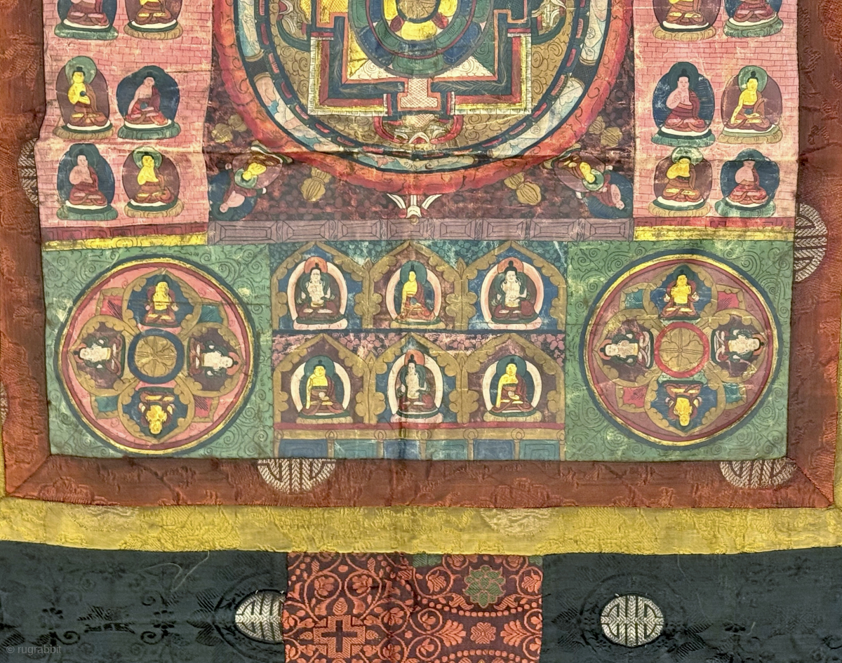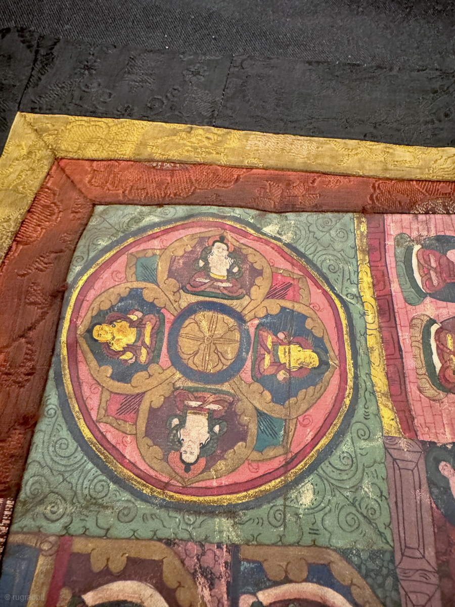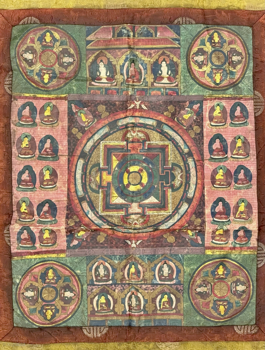 a beautiful antique Tibetan silk painted Buddhist Thangka from 19th century Tibet. At the centre of the colourful design is an elaborate Mandala with Buddha / Lama figures on each corner. The borders consists of more double Buddhist figures 10 on each side, 6 on the bottom and 3 on top. Lovely smaller circular mandalas on the corners with further Buddhas. It edged with dark indigo silk brocade fabric. Lovely piece in good overall condition and patina. Offered at a fair price. size: 101cm x 69cm (40” x 27”). Email your questions. .. (If you message via rugrabbit and don’t get a response within 24 hours, then your message hasn’t got to us so please email directly to: istalificollections@outlook.com )