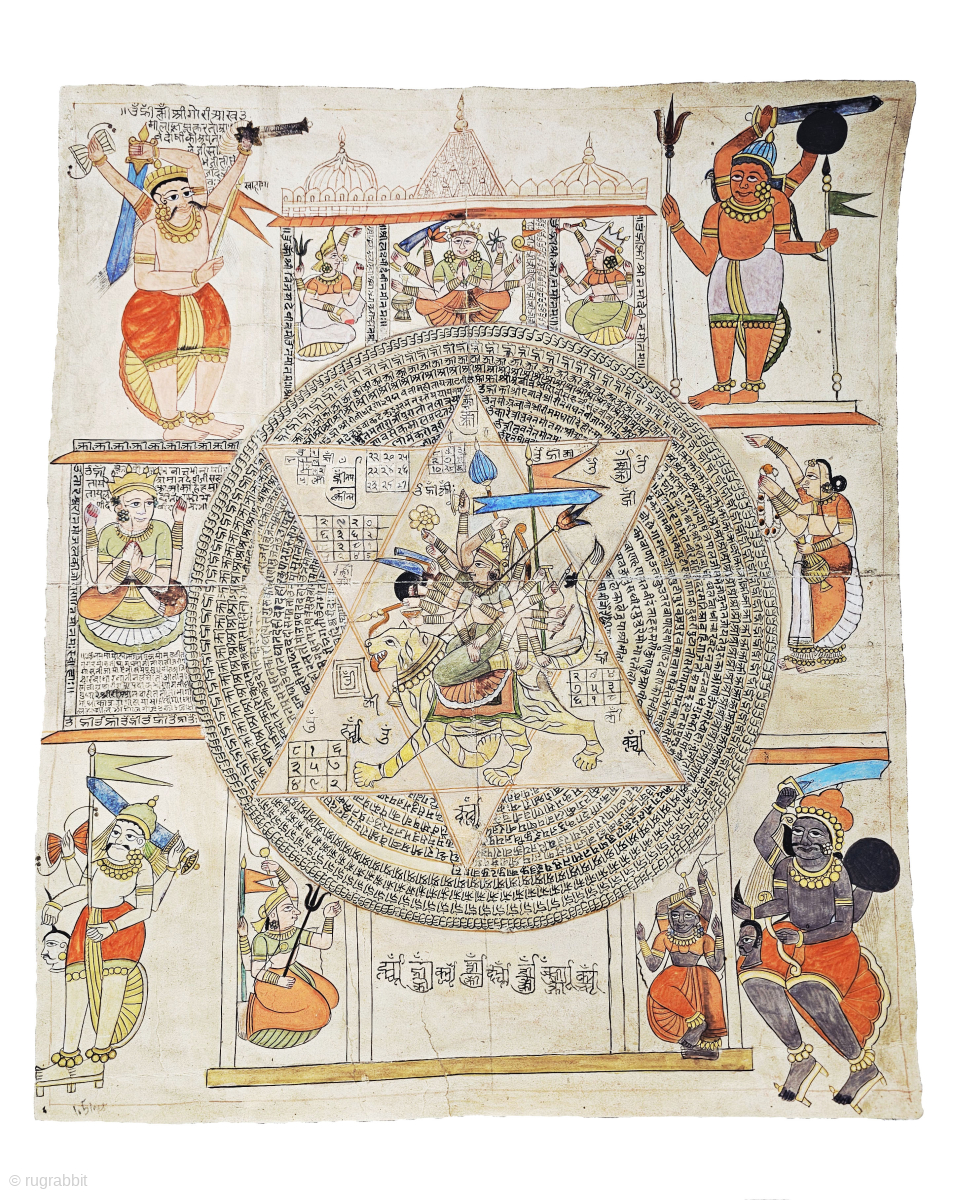 The composition reflects deep esoteric knowledge and devotional practice, making it a rare and important example of Indian Tantric ritual art from the late 19th century.