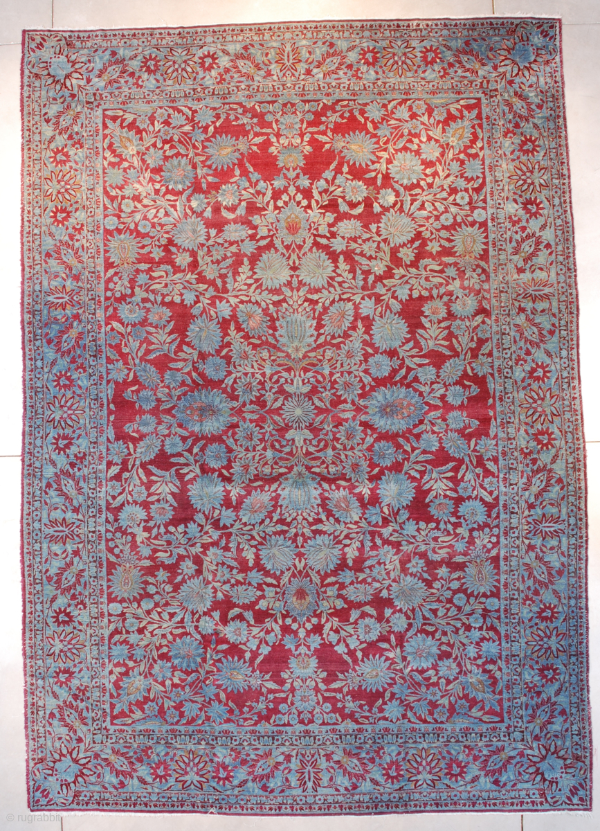 This Agra antique carpet from India measures 9’10” x 14’1” (302 x 430 cm). Hey, is this a fantastic rug, or not? Unbelievable color, color, color! This third quarter 19thcentury Indian carpet is beautiful. When i first saw it, it actually took my breath away and made the hair on my arms stand on end to the extent that the guy i was buying it from looked me up and down and said ‘i guess you like it , don’t you?’ It was so obvious that i couldn’t even bargain on the price! The Prussian blue on a deep ruby ground is astonishingly lovely. There really are only two colors in this rug. Several blue tones and deep ruby red with touches of lighter red for accent. The rug has excellent pile (although these rugs never had a thick pile, they are cut short). The rug is very finely woven. The ends and sides are complete. It is clean and ready to go.