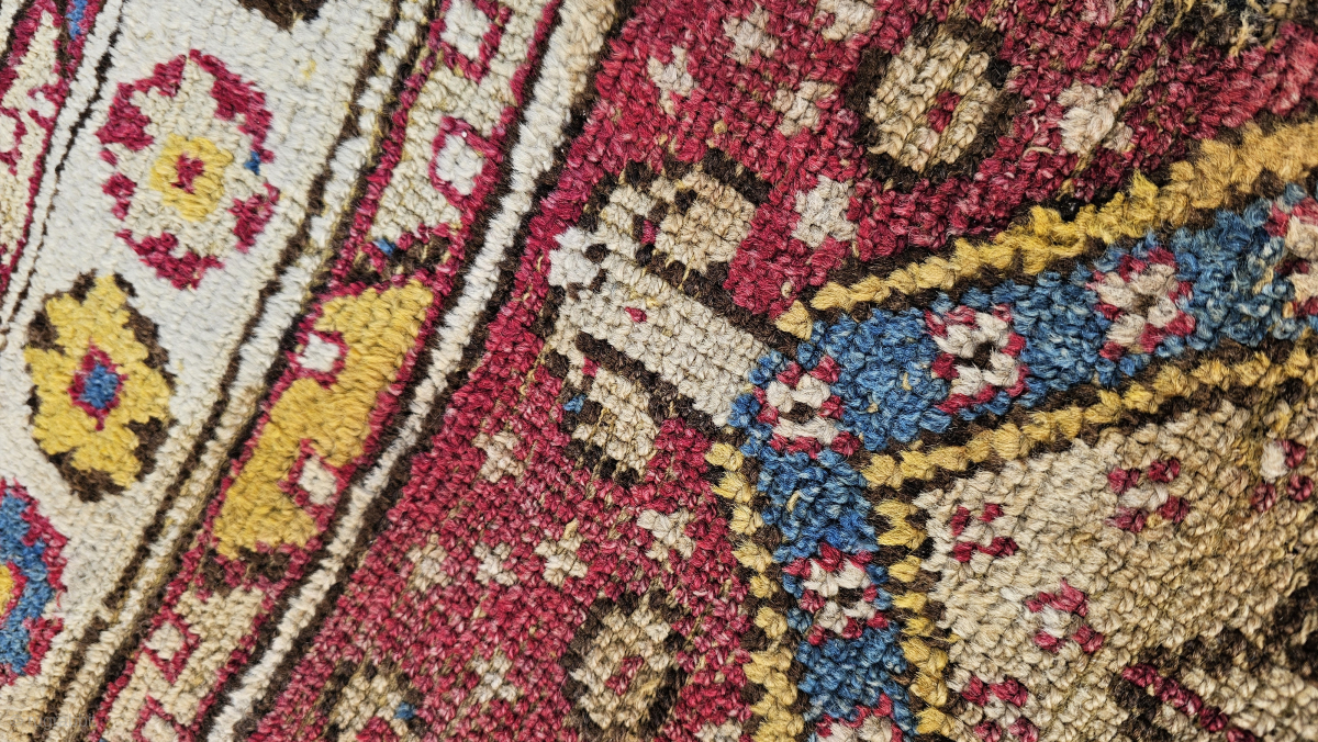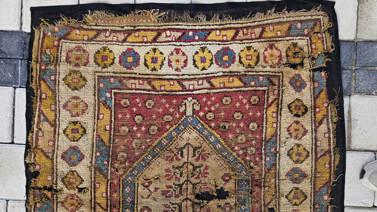 A rare survivor. This 114x140 cm carpet fragment, now carefully mounted on textile, showcases the intricate geometry and earthy dyes of the Balkan weaving tradition. a masterpiece of history for the modern wall.