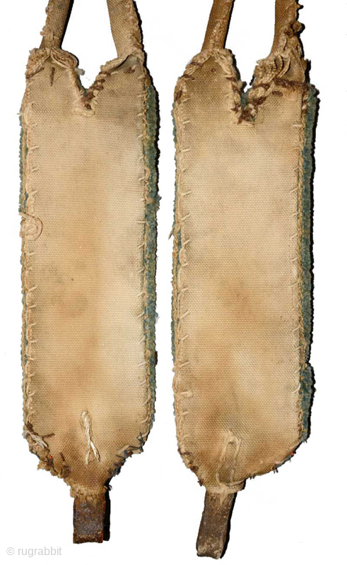 Matched pair of decorative Tibetan horse trappings which would have attached at rear to either side of the saddle and then run back over the horse’s rump where and then fastened around (under) the tail by the long hide straps. Made circa the early 1900’s, the size of the pile sections are 23cm x 7.5cm (approximately 9in x 3in), the warp and weft is hand spun wool and it is back by a canvas-like material. Not easy today to find a genuinely old matched pair like this still in good, though well used condition. See more photos and information here https://warpandweft.club/portfolio-item/tack-item-5/ and other horse tack here https://warpandweft.club/portfolio-item/other-horse-tack/