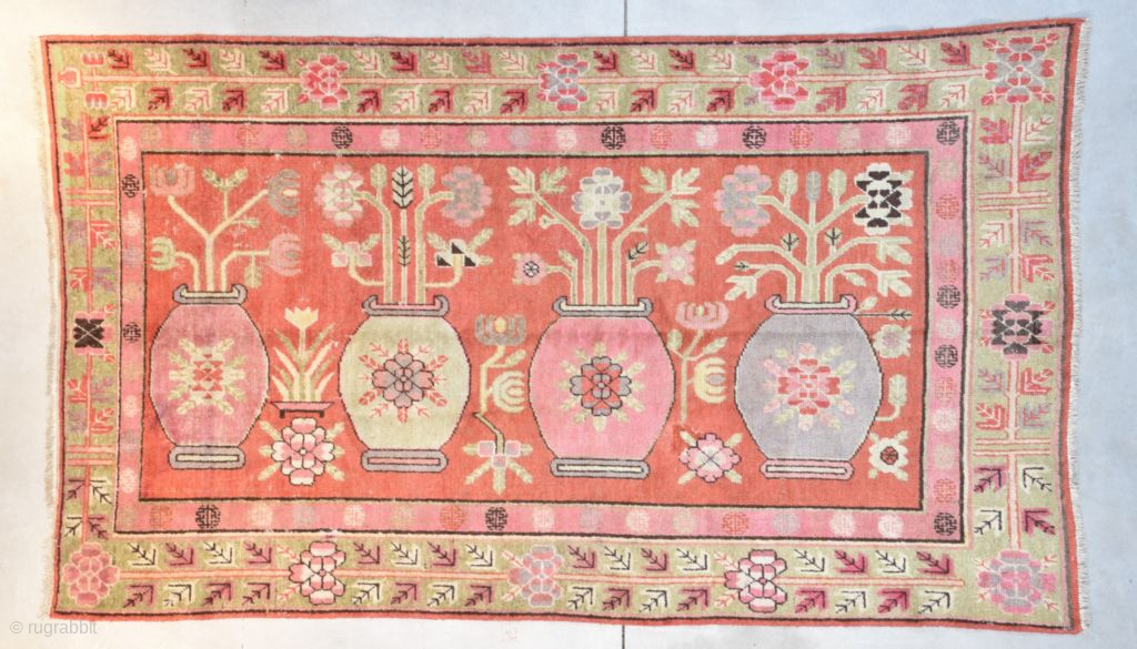 This circa 1920 Khotan handmade wool Oriental rug measures 8’1” x 5’0”. It has a depiction of four urns. Two urns are in pink, one in very pale green and one in blue. Each display a beautiful floral motif. The field is covered in a floral motif. The interior minor border has flower heads on a pale pink ground. The major border is a very pale green with floral motif. The rug shows minor wear here and there which is always visible on rugs of this type. i have never seen a full pile one. The ends and sides are complete. It is clean and ready to go.