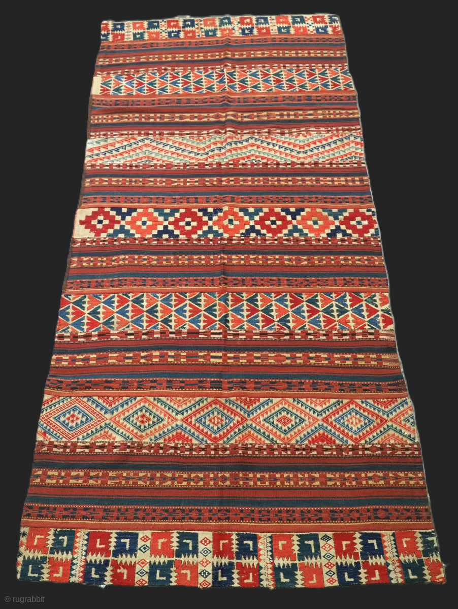 This interesting kilim is woven in 13 individual strips that are then stitched together, each strip is decorated with different design in various embroidered of weft work techniques. This is a very good example of this scarce type of Uzbek weaving.