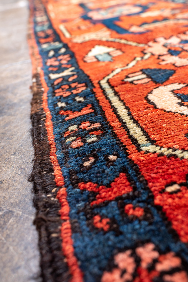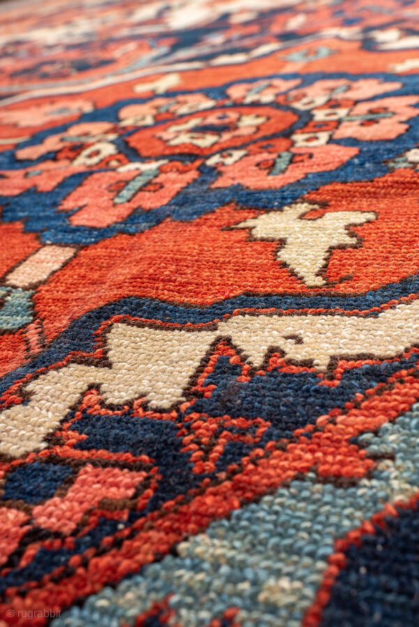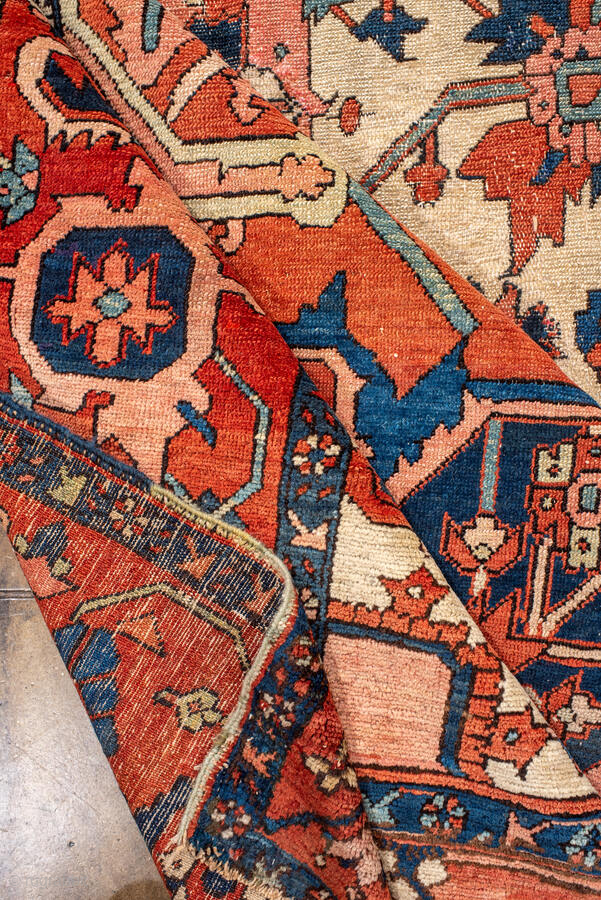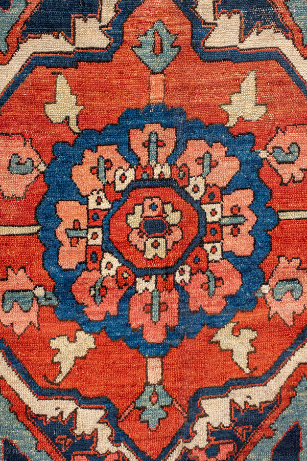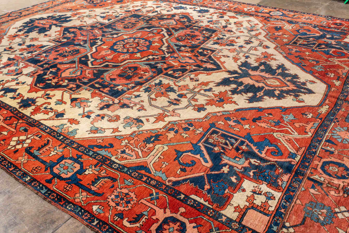 Antique Persian Serapi Carpet, circa 1880. Featuring a grand geometric medallion on an ivory field with rich brick-red and deep indigo accents, framed by a bold tribal border. a classic Northwest Persian statement piece with strong architectural presence.