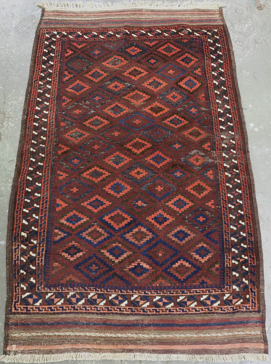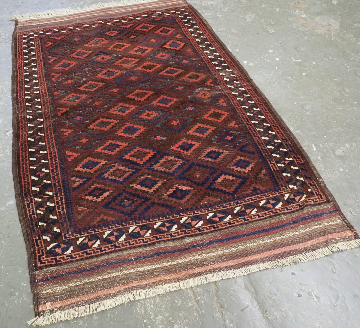 a superb and scarce rug with a repeat diamond design on a rich aubergine ground, the diamonds are in varying shades of madder and indigo. The use of white wool in the border stand out against the rich palette of the rug.