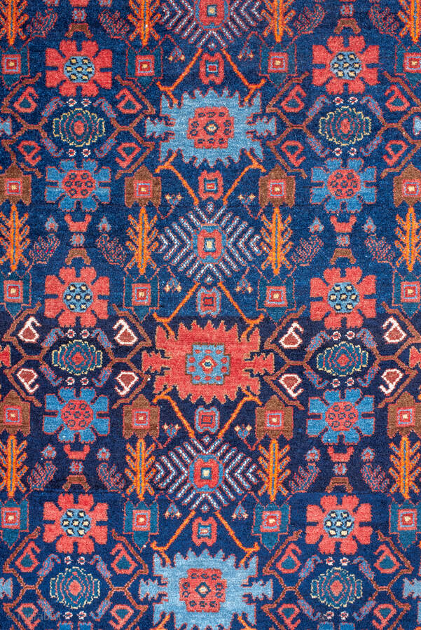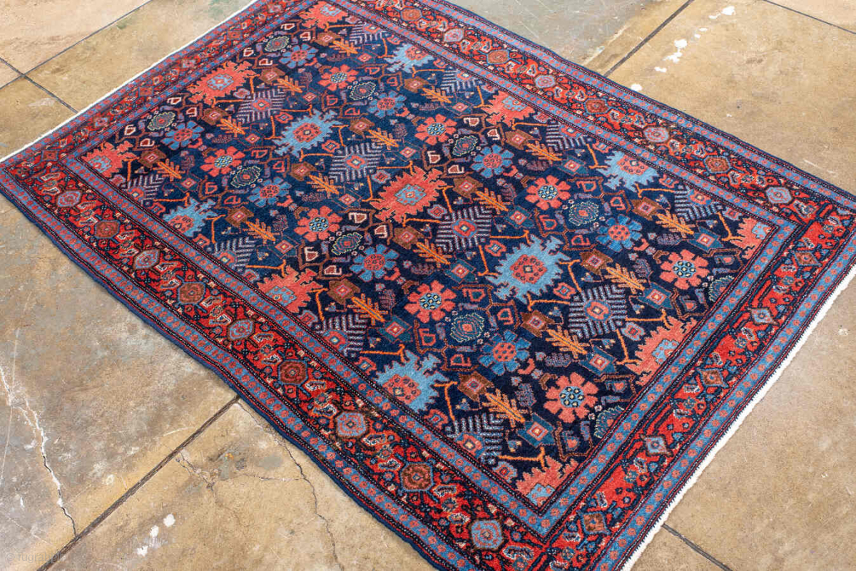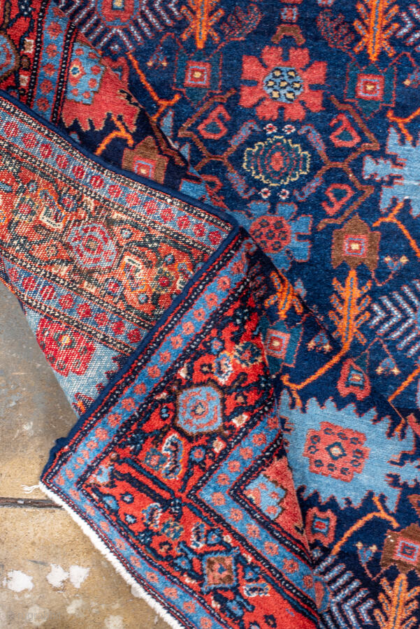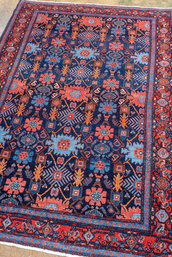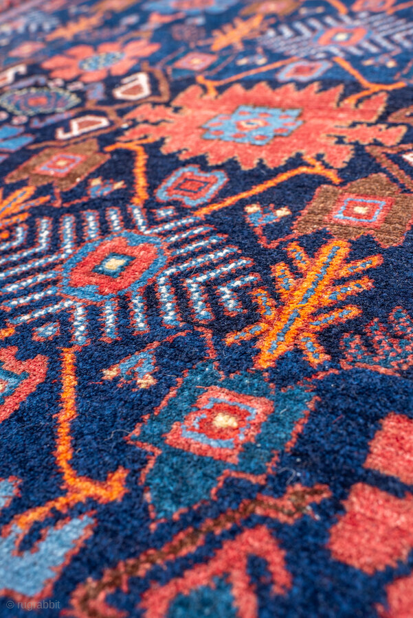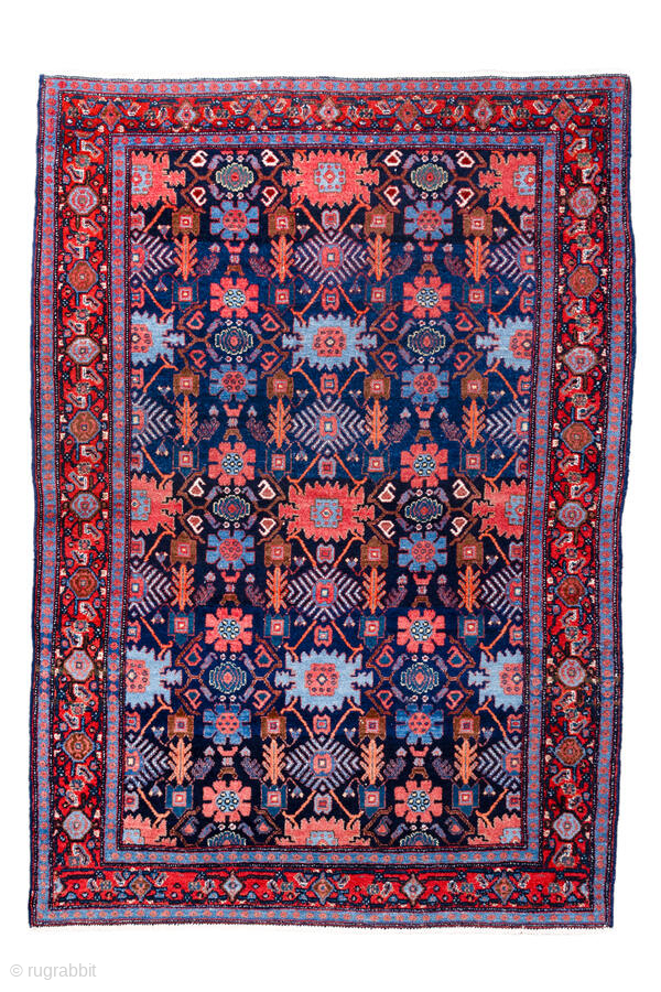 Antique Persian Senneh Rug, circa 1900. Featuring an intricate allover Herati design on a deep indigo field with soft coral and ivory accents, framed by a finely detailed border. Tightly woven with crisp drawing and refined village character.
