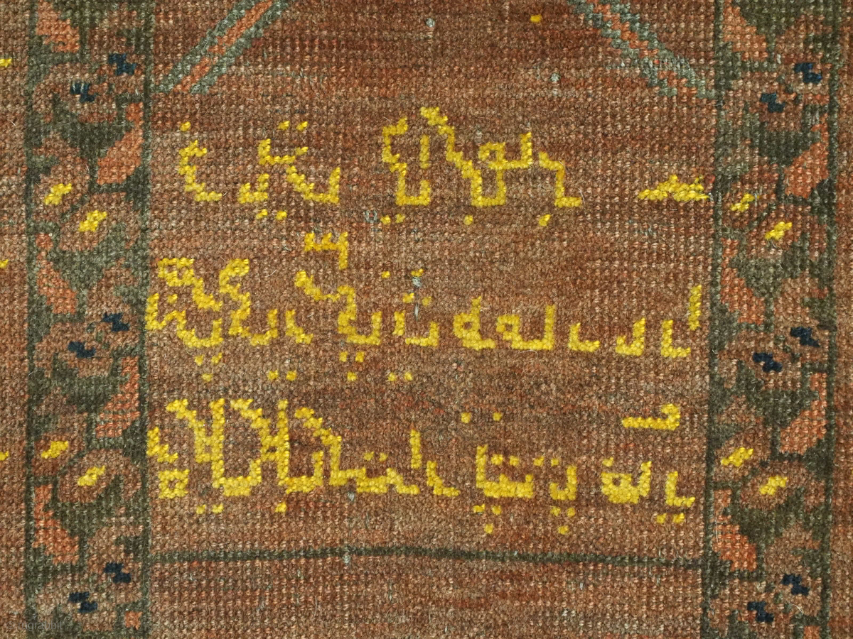 a very rare Afghan prayer rug which is inscribed and dated, the date reads 1310.... which translates to 1892; the inscription is below the mihrab and in the main field of the rug. This rug was obviously of great importance to the weaver or more likely the person who commissioned it. The rug was probably woven by the Kizil Ayak Turkmen in Northern Afghanistan.