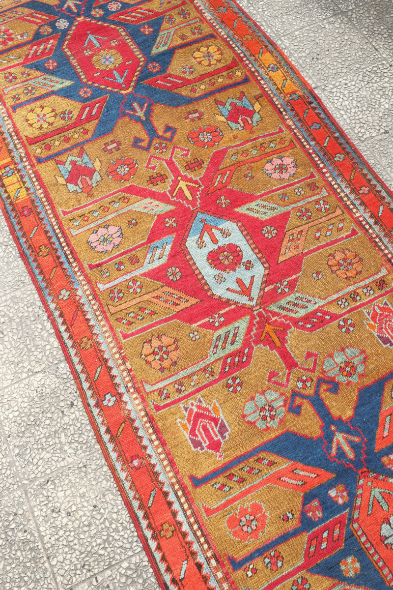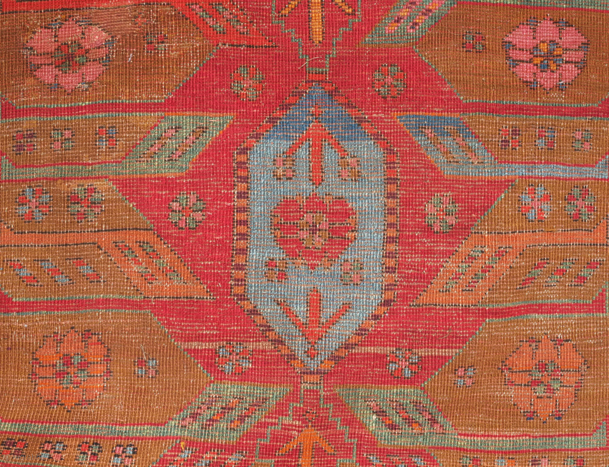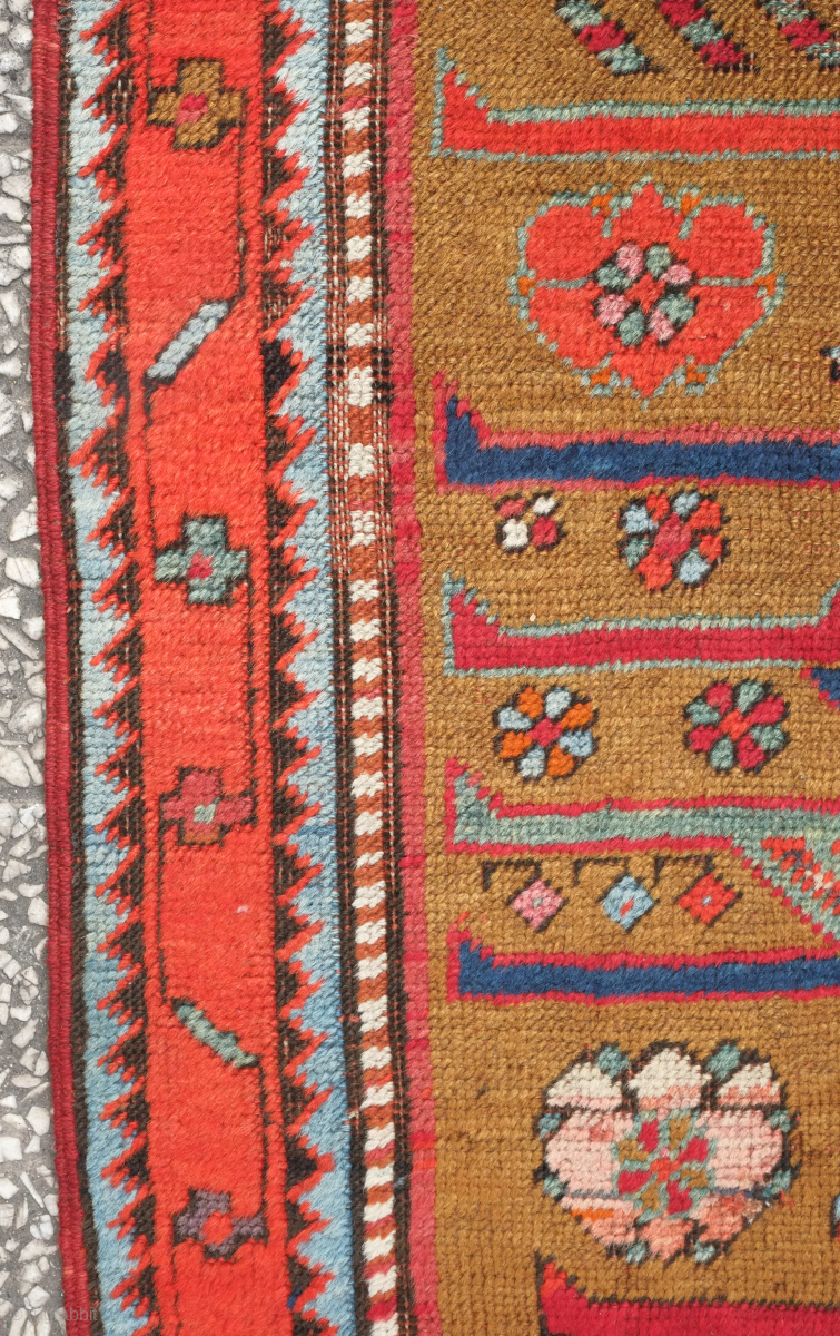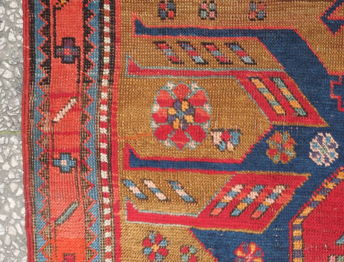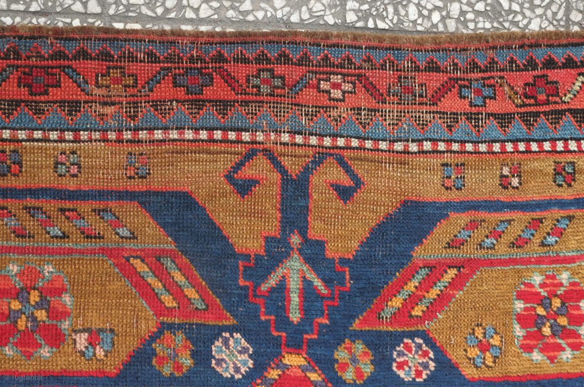 Caucasian rug, late 19th/early 20th century. The large eagle medallions appear in Talish rugs and the weave has some similarities to Talish weaving. The colors and layout of the borders suggest some other affiliation. Some lower pile in the top area of the field and borders. 83 x 221 cm. Contact danauger@tribalgardenrugs.com