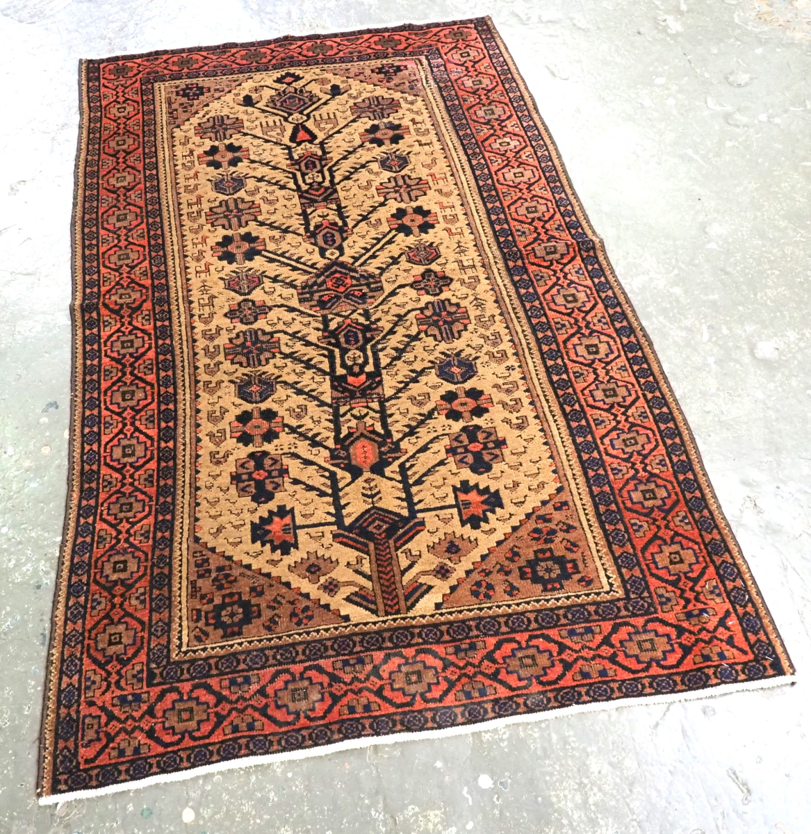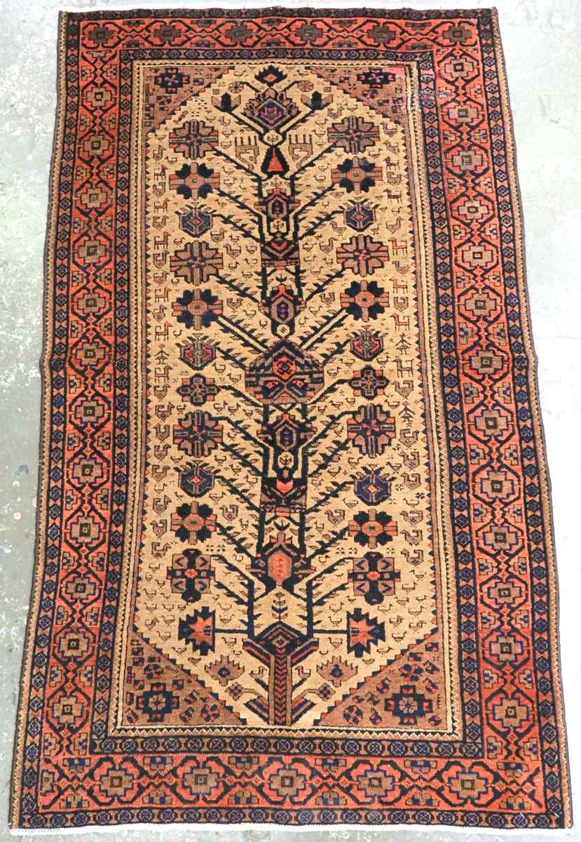 The rug has a traditional design unique to this region, the floral tree design is on a camel ground. Note the small birds, animals and other tribal devices.