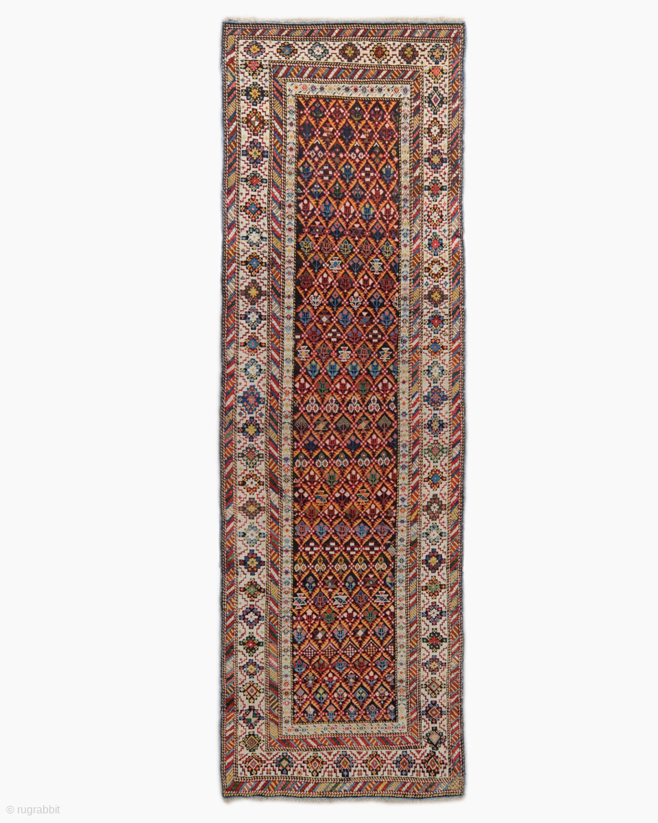This rare late 19th century Caucasian Kuba Shirvan runner highlights a powerful and rhythmic geometric composition featuring an all over “lattice” or “honeycomb” design of interlocking diamonds, each containing minute, multi colored tribal icons anchored within a deep, saturated mahogany bronze field. This structural balance between the densely repeating central motif and the elongated runner format reflects the pinnacle of the Northeast Caucasian weaving tradition, where precision and intricate detail were the primary hallmarks of the Kuba district.