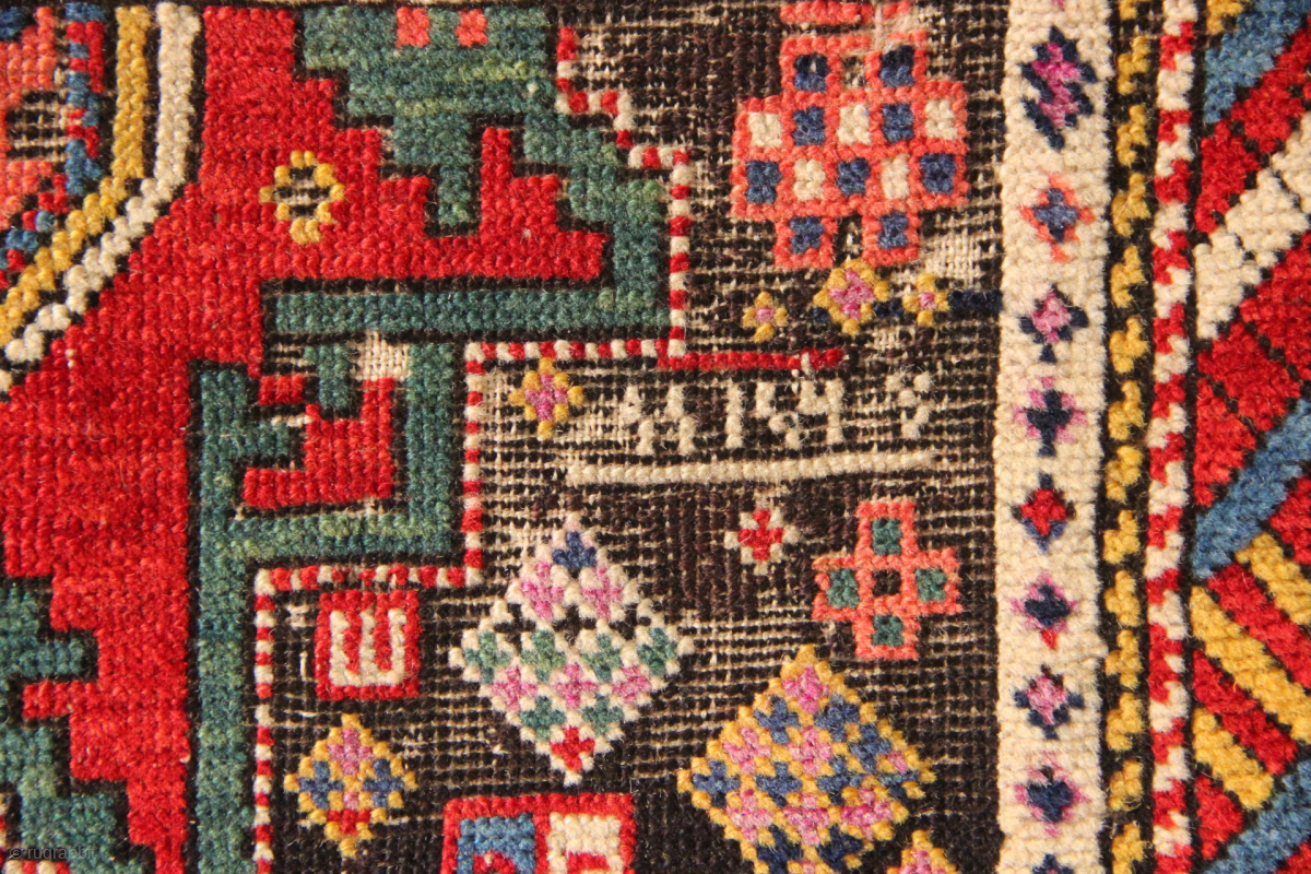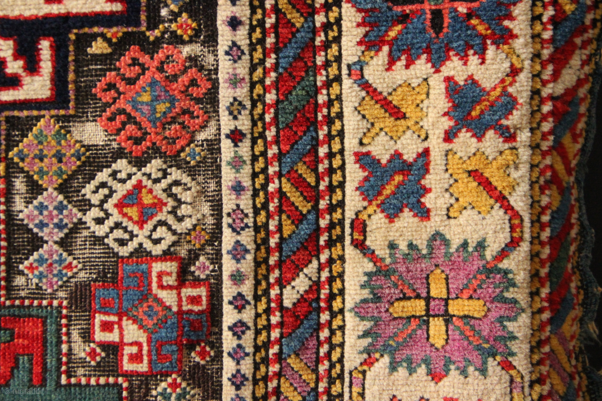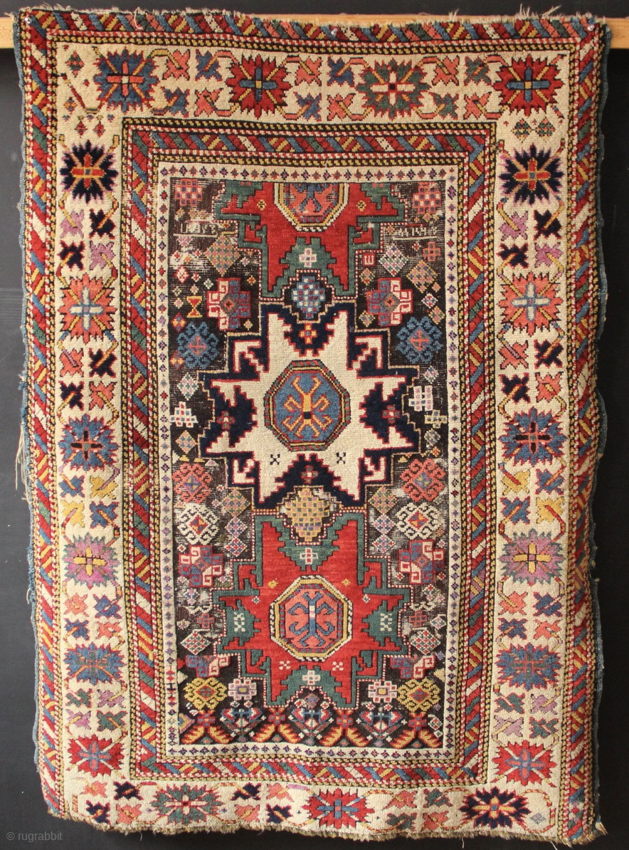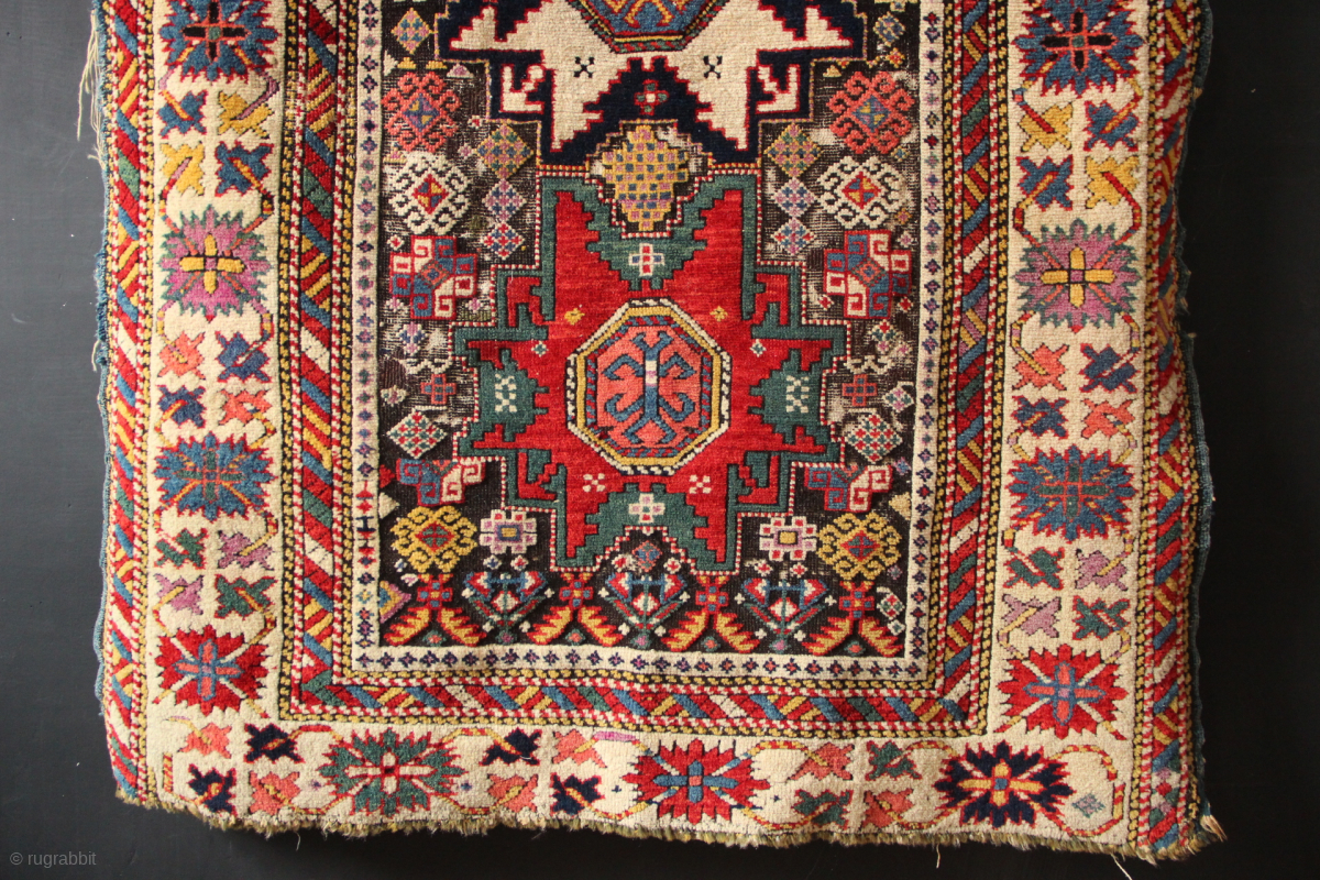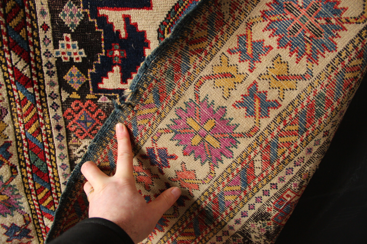 Fantastically colourful and fine old Lesghi Shirvan small rug that has seen better days but still shines. Absolutely gorgeous. Dated or inscribed twice. a good dollop of Mauvine but still an early piece with mostly good pile and most of the three-ply side cords in blue cotton. Lovely.