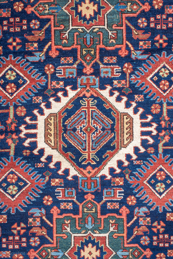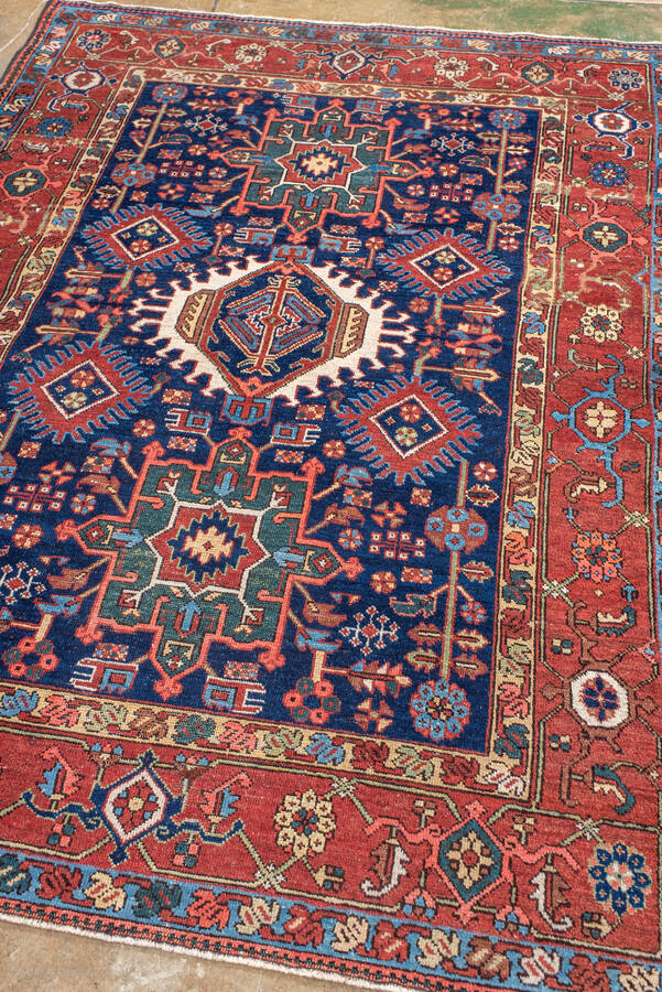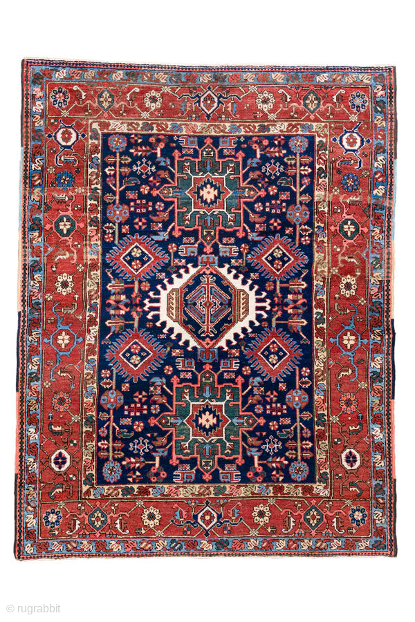 Antique Persian Karaje Rug, circa 1910. Featuring bold geometric medallions on a deep indigo field with red and ivory accents, framed by a classic angular border. Strong village character with crisp drawing and lively contrast.