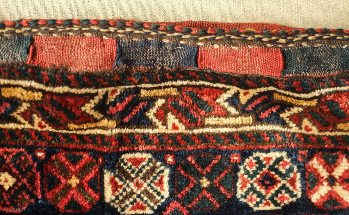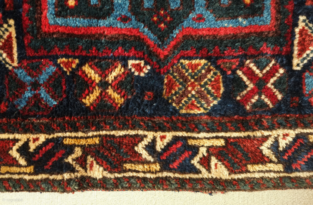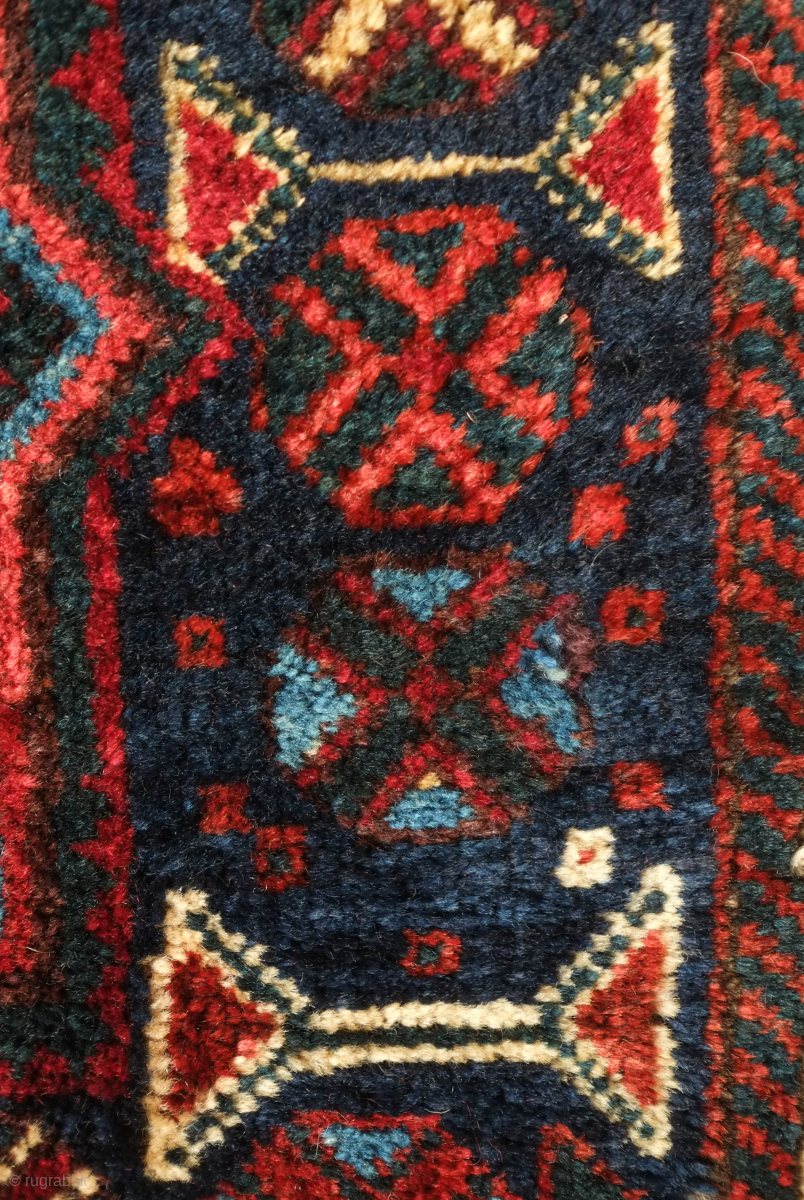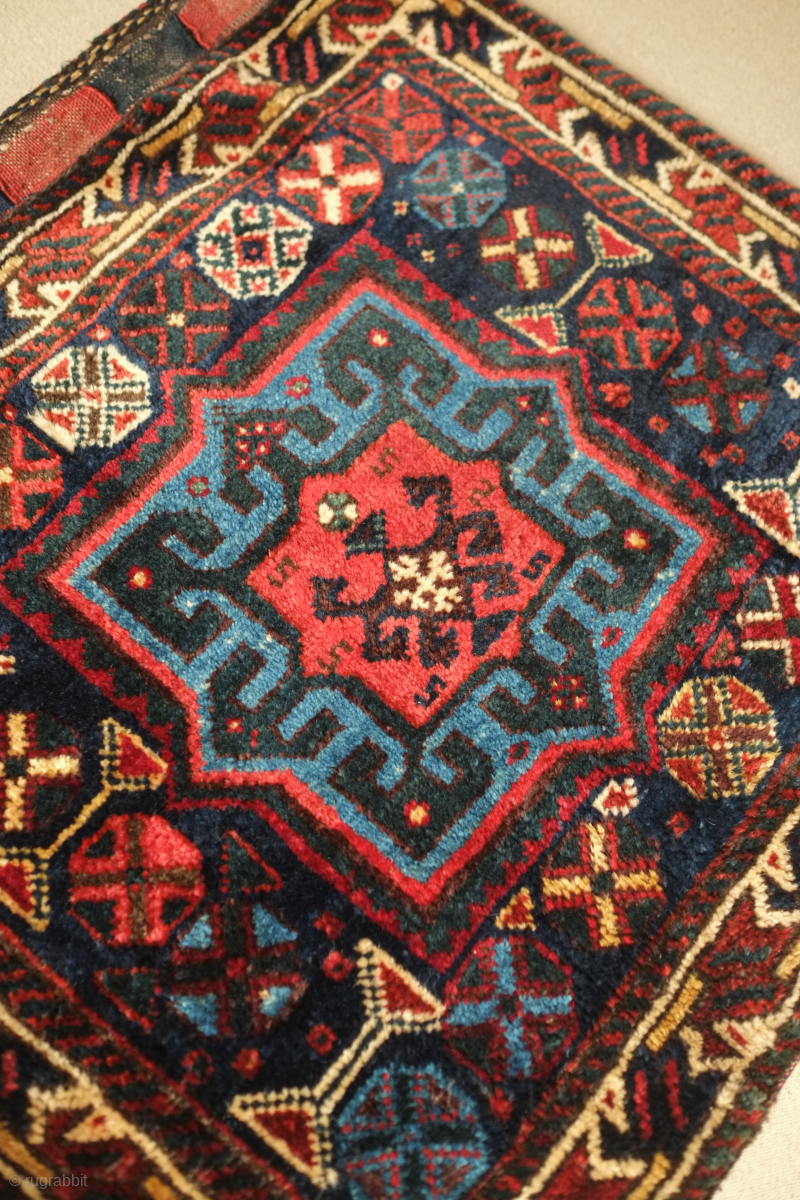 Lori saddle bag, one side, 19th century. Lustrous wool. Excellent drawing in the central medallion which floats on the field and other motifs. Dark duck head green in the arms the medallion. Very slight moth nibbles on the bottom left hand corner. 72 x 65 cm. Contact danauger@tribalgardenrugs.com