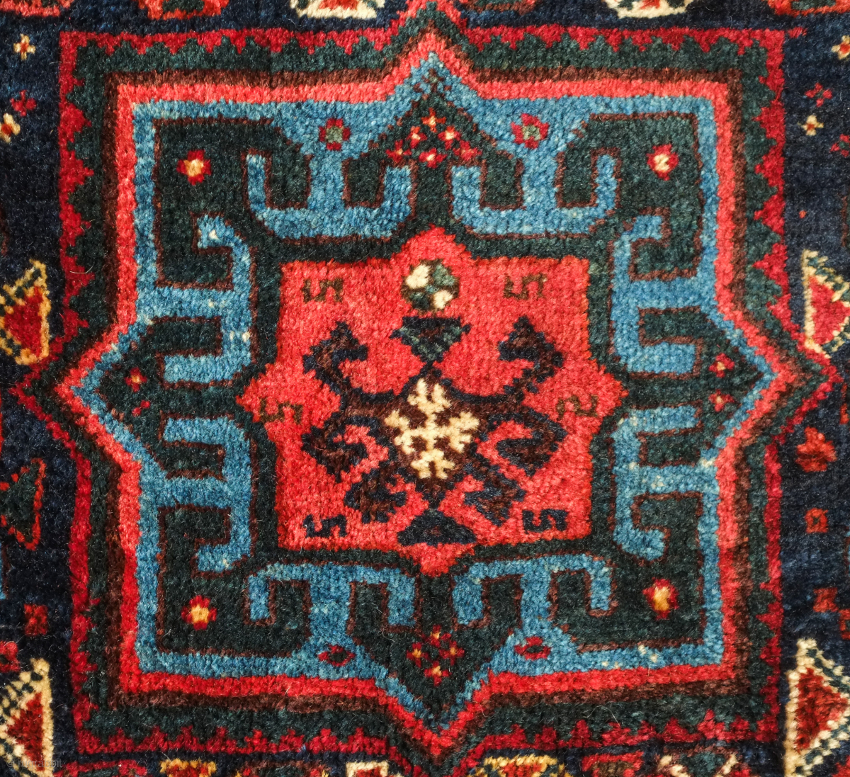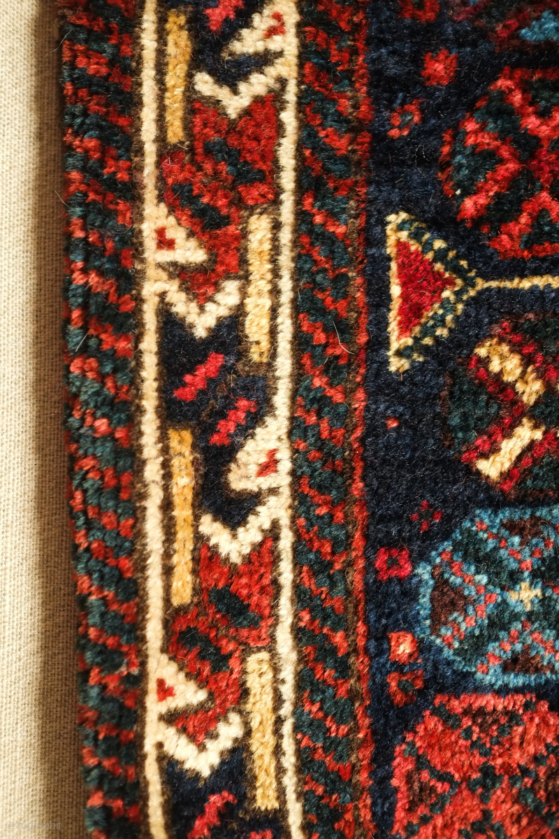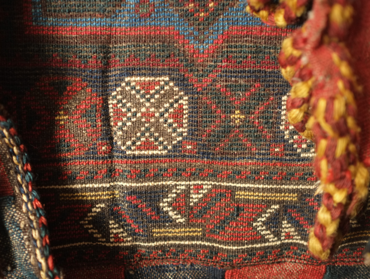 Lori saddle bag, one side, 19th century. Lustrous wool. Excellent drawing in the central medallion which floats on the field and other motifs. Dark duck head green in the arms the medallion. Very slight moth nibbles on the bottom left hand corner. 72 x 65 cm. Contact danauger@tribalgardenrugs.com