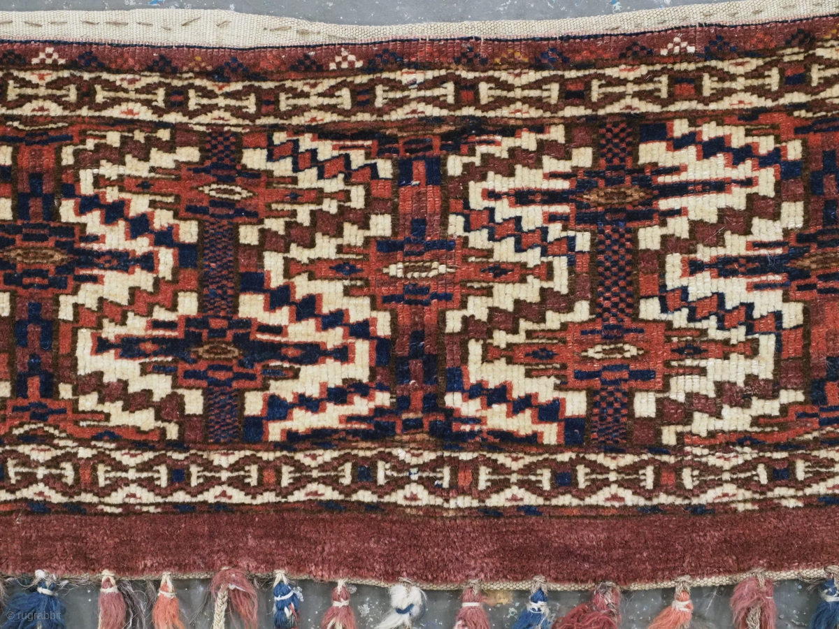 This example has a variant serrated lattice and erre gul design on an ivory ground. This is very similar to the design that is often found on Yomut asmalyk. The torba is complete with a ivory plain weave back and has the added interest of retaining all of the original long tassels.
