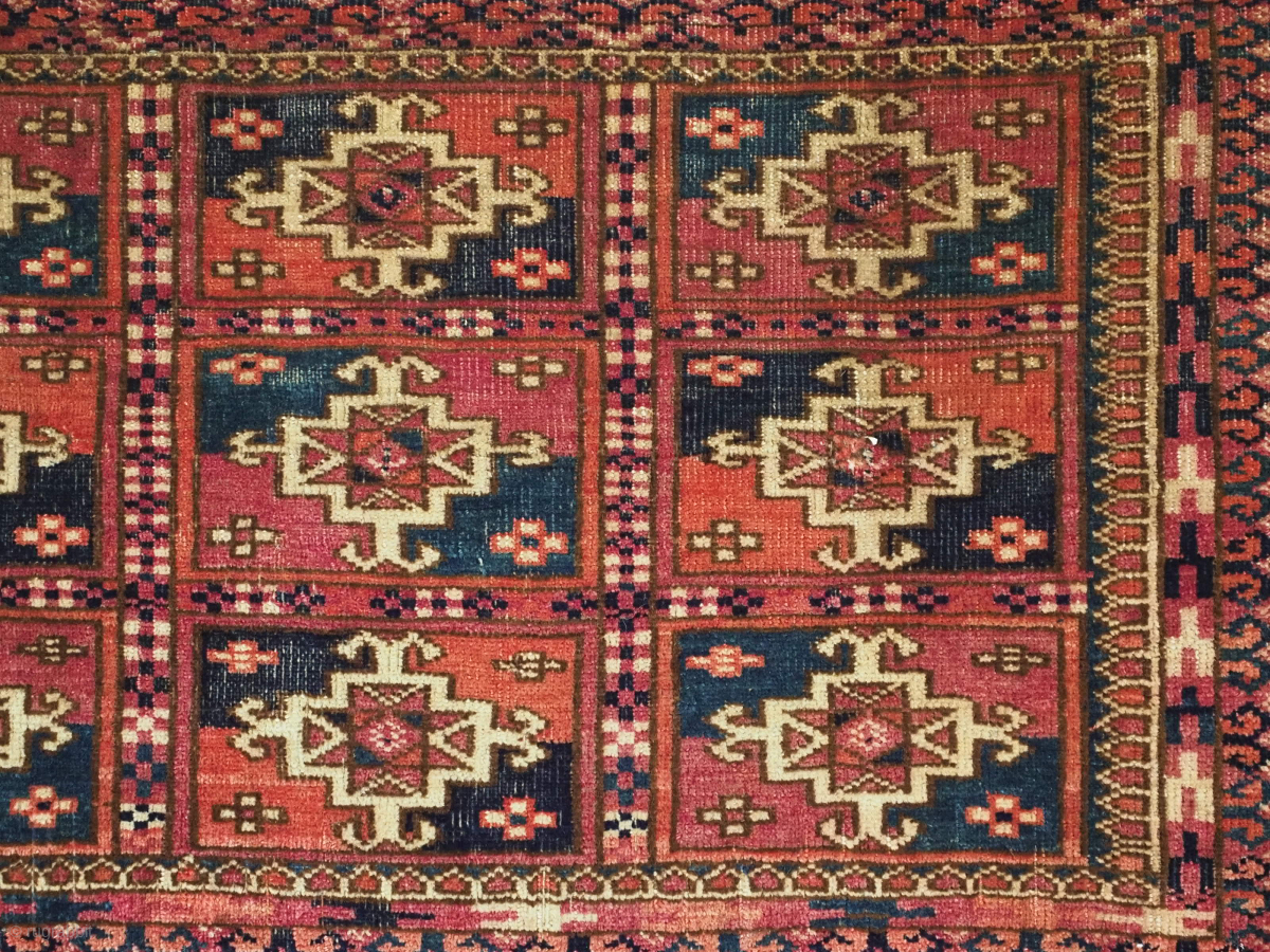 This small Tekke Turkmen mafrash is the face of a small bag used for keeping personal belongings in, it was usually hung up inside the yurt. This example is of 'aina' gul design, there are four rows of three box like guls containing the kotchak design, which is filled with a star. The purple / pink dye is cochineal or lac.