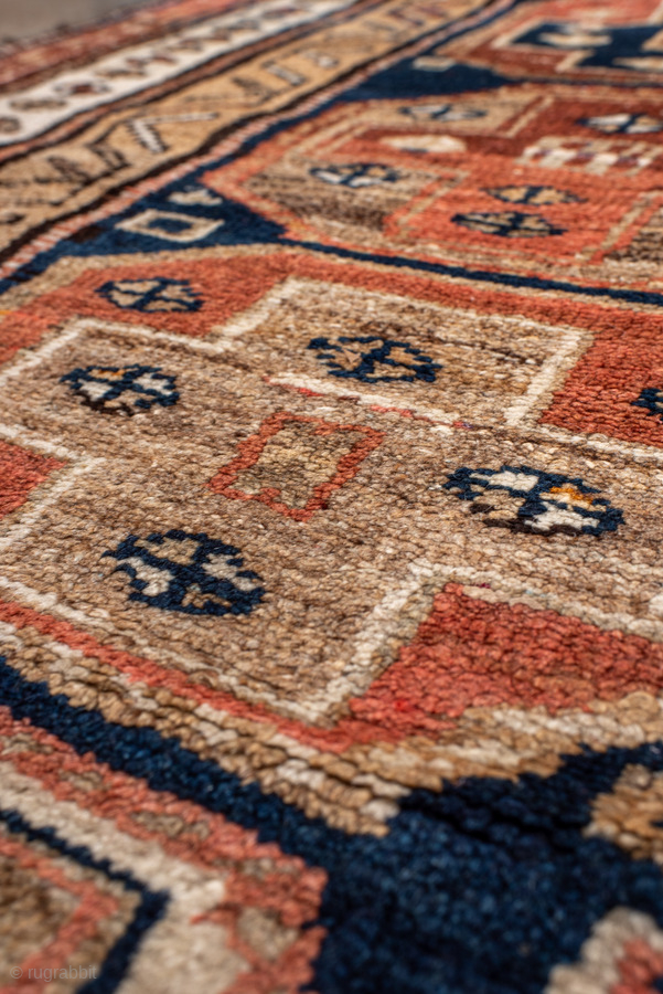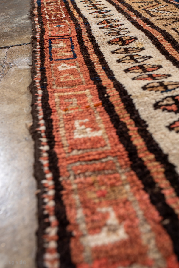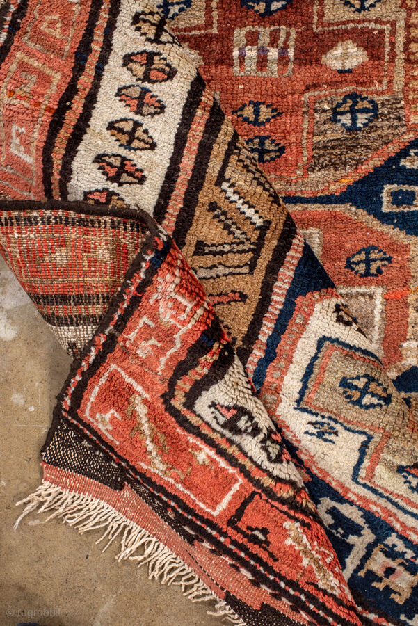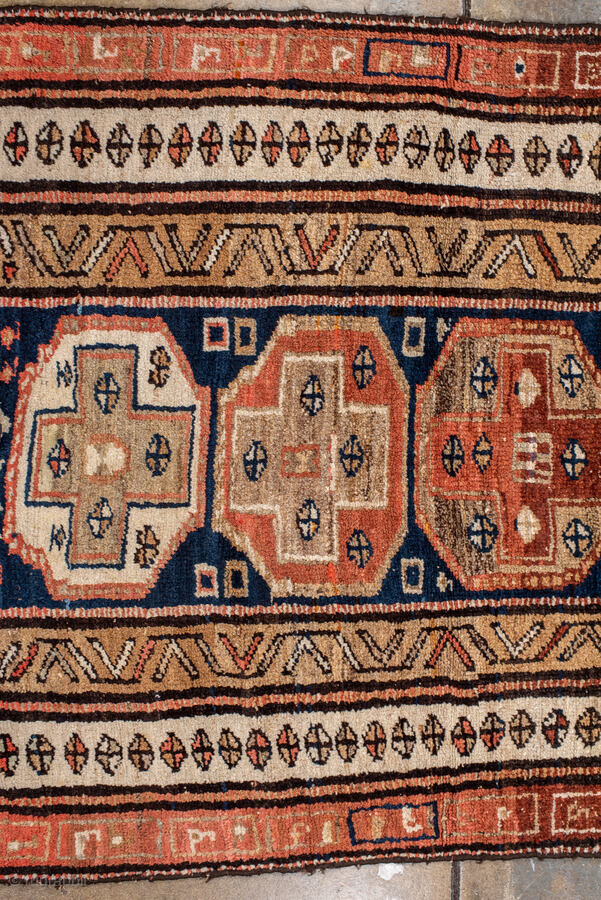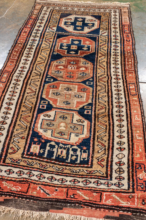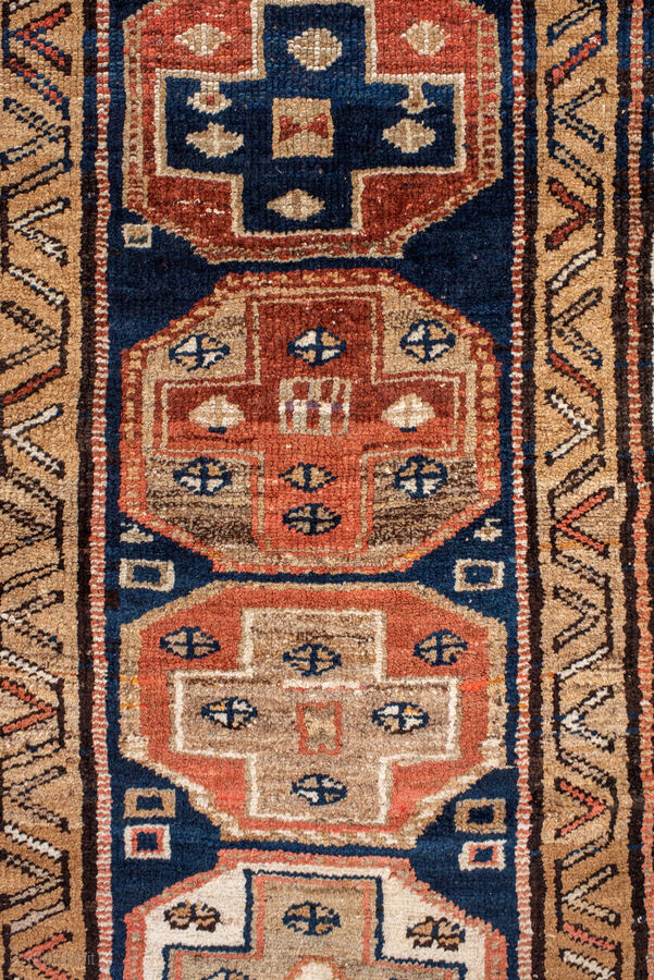 Antique Persian Kurdish Runner, circa 1910. Featuring stacked geometric medallions on a deep indigo field with soft coral and ivory accents, framed by simple tribal borders. Bold, graphic village weaving with strong character.