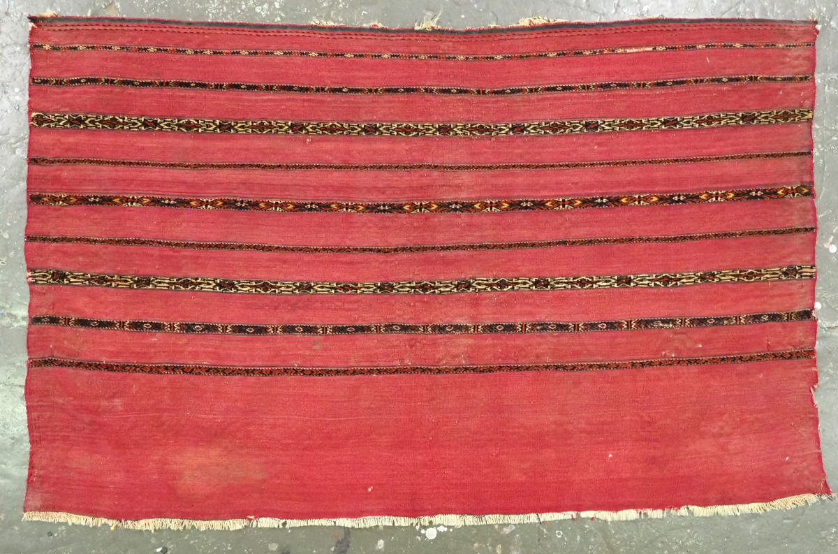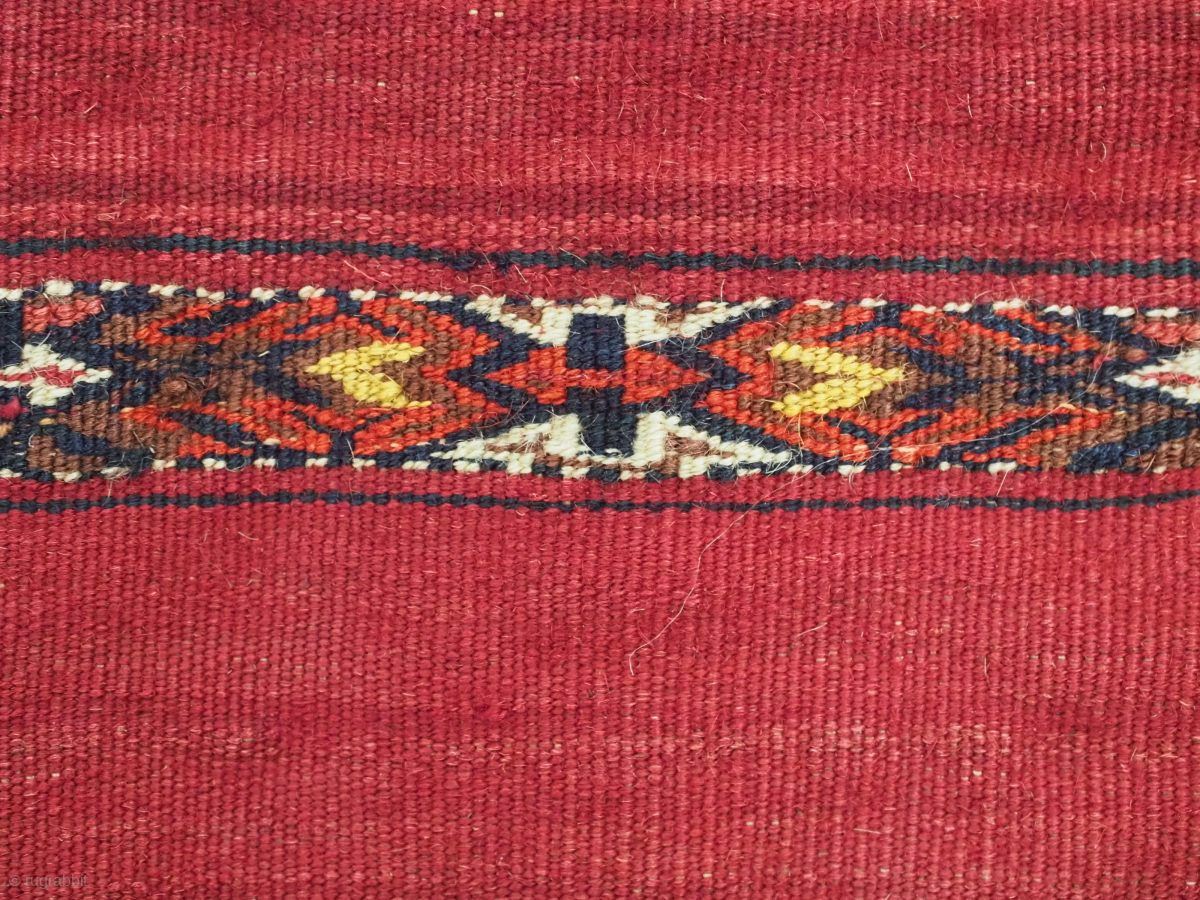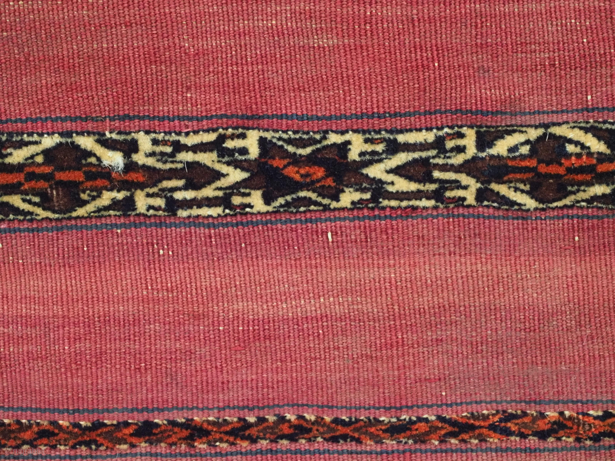 This example is of classic design with very fine decorated bands in pile and flatweave on a madder red ground. These are considered to be the finest knotting of all Tekke weavings. At some time in it's history the back has been removed.