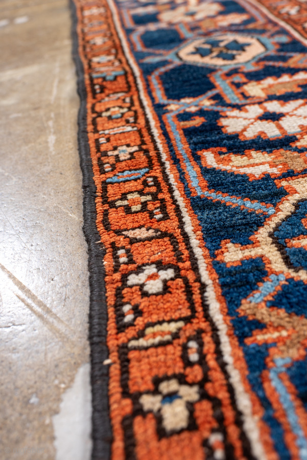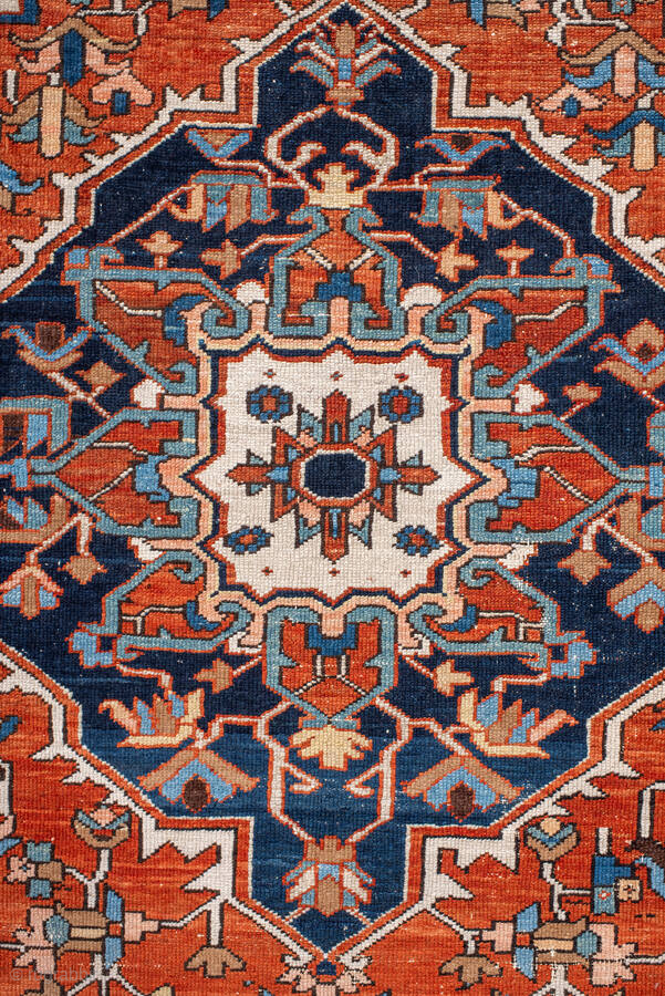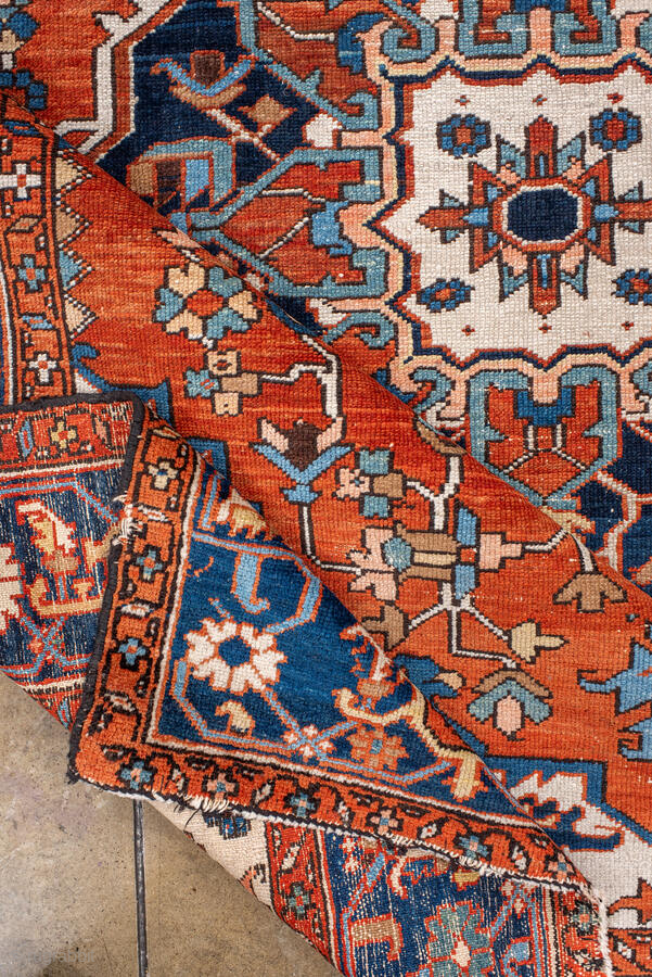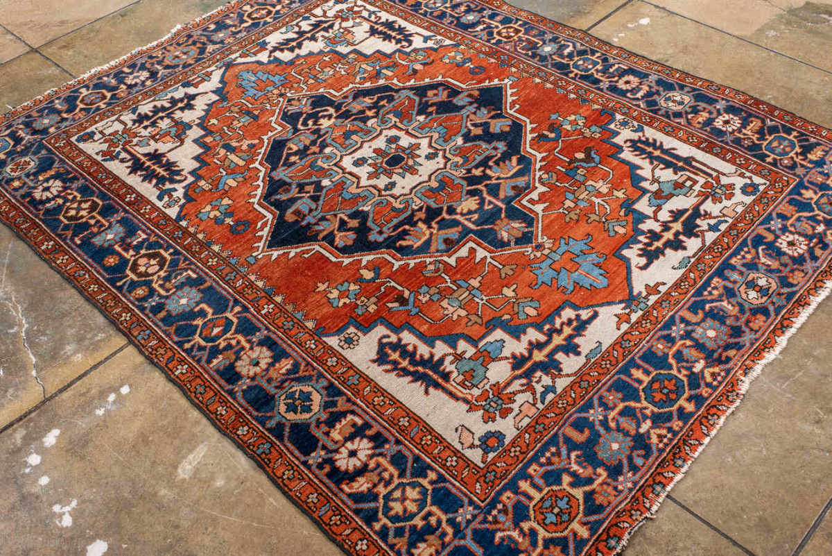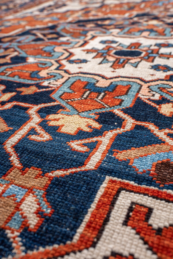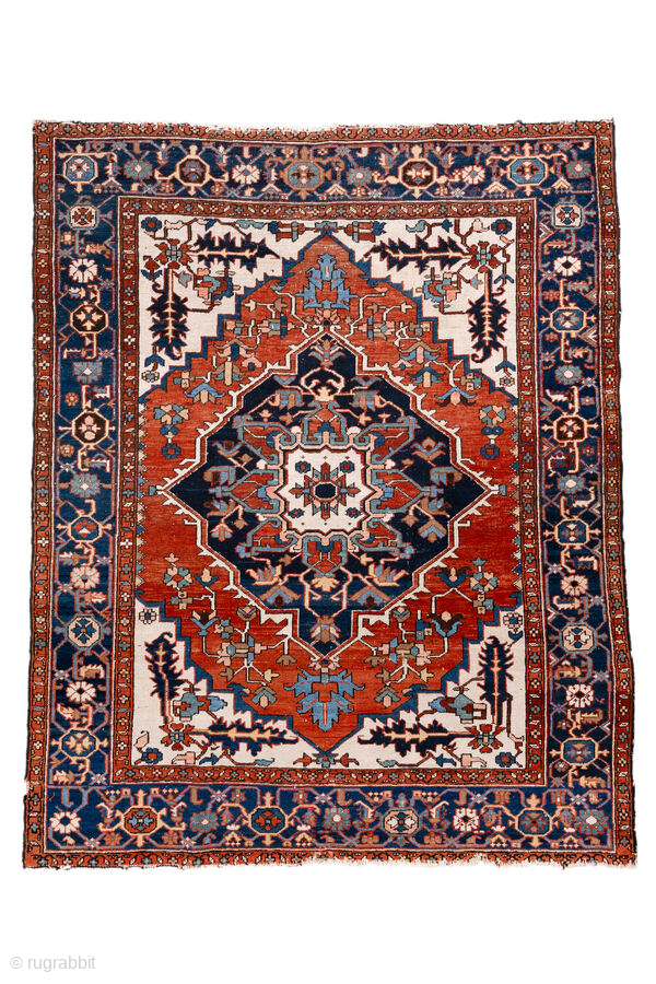 Antique Persian Serapi Rug, circa 1900. Featuring a bold geometric medallion on an ivory field with rich red and deep indigo accents, framed by a classic Heriz-style border. Strong Northwest Persian village design with striking contrast.