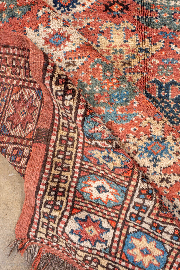Antique Kurdish Rug, circa 1900. Featuring an allover tribal pattern on a warm rust field with soft blue and ivory accents, framed by a geometric star border. Lively village weaving with bold color and rhythmic design.