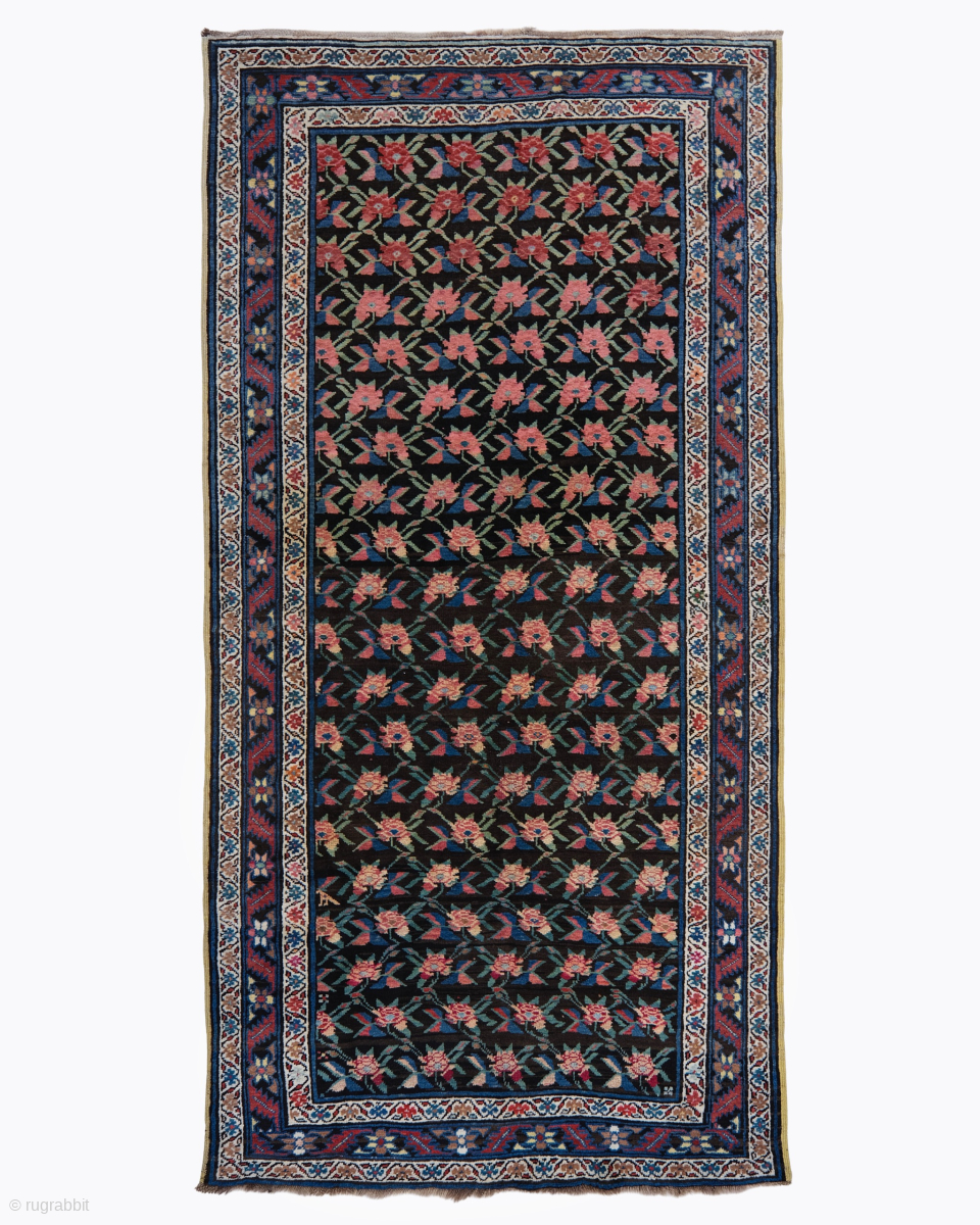 This rare late 19th century Caucasian Karabag rug highlights a powerful and rhythmic floral composition featuring an all over “Gül Firangi” or French Rose design anchored within a deep saturated charcoal black field. This structural balance between the precisely repeating rows of blossoming pink roses and the dark expansive ground reflects the pinnacle of the Karabag weaving tradition in the Southern Caucasus. Rugs of this era are world renowned for their unique synthesis of Western European botanical aesthetics and traditional Caucasian weaving techniques which became highly fashionable during the late Russian Imperial period.